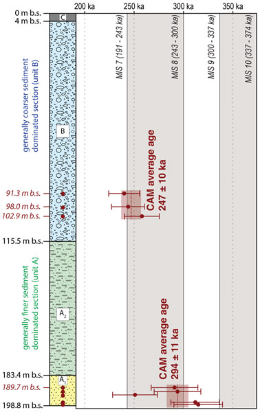 Depositional single-grain feldspar luminescence ages reveal the filling of a glacially overdeepened basin during Marine Isotope Stage 8, representing rare evidence of this time frame in the northern Alpine foreland. Reflection seismic surveys revealed two cross-cutting glacial basins. The dated sediments reveal significantly younger ages than previously assumed. This represents a first step in a re-evaluation of the established Quaternary depositional chronology of the Bavarian Alpine foreland.