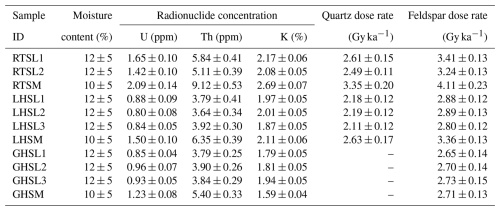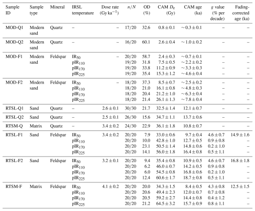 Radionuclide concentrations measured on the three samples are reported in Table 2. The matrix sample (RTSM) shows slightly higher radionuclide concentrations, resulting in quartz (3.4 ± 0.2 Gy ka−1) and feldspar (4.1 ± 0.2 Gy ka−1) dose rates that are approximately 25 % higher than those of the sand lens samples (quartz: ∼ 2.5–2.6 Gy ka−1; feldspar: ∼ 3.2–3.4 Gy ka−1).