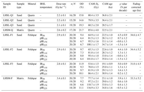 Feldspar fading rates (g2 d) estimated after excluding the first prompt measurement (see Sect. 3.4) are reported in Table 3. While significant fading rates were measured for the IR50 signal of all three samples (∼ 4.3 %–4.6 % per decade), the pIRIR signals exhibited much lower fading rates: ∼ 0.7 %–0.9 % per decade for pIR110, ∼ 0.2 %–0.5 % per decade for pIR170, and ∼ 0.5 %–0.8 % per decade for pIR225. According to earlier studies, a fading rate < 1.5 % per decade is considered negligible as it might result from measurement artefacts (e.g. Buylaert et al., 2012; Thomsen et al., 2008). Therefore, only the IR50 ages are corrected for fading (Thiel et al., 2011; Serra et al., 2025), while pIRIR fading-corrected ages (Table S1) are not considered further in the paper.