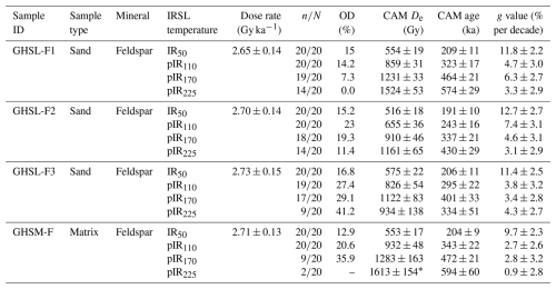 Thermal transfer tests were carried out on bleached quartz aliquots at preheat temperatures ranging from 150 to 210 °C. Average De values close to zero were measured at each temperature (Fig. 6a and b), indicating neither thermal transfer nor dependence on the preheat temperatures. Dose recovery ratios measured on quartz and feldspar aliquots are within 10 % of unity for all the tested quartz OSL preheat temperatures (Fig. 6c and d) and feldspar IR stimulation temperatures (Fig. 6e and f), confirming the reliability of both the measurement protocols. A preheat temperature of 190 °C was employed for the quartz measurements (Table 1). In both the thermal transfer and dose recovery tests on quartz aliquots, the De values remained consistent and showed no dependency on preheat temperatures within the range of 190 to 210 °C; this thermal stability confirms the preheating temperature of 190 °C is sufficient to remove thermally unstable luminescence components, ensuring accurate and reliable estimation of OSL ages through the SAR protocol. The resulting overdispersion (OD) values for the dose recovery tests from all investigated samples are < 2 % (Table S3 in the Supplement), significantly lower than the OD values observed for their natural De distribution (Tables 3, 4, and 5). This discrepancy may have resulted from partial bleaching and/or dosimetric heterogeneities. However, the OD of all the sand samples remains lower than 24 % with the exception of samples GHSL-F3, MOD1, and MOD2 (Tables 3 and 5). Although these three samples exhibited relatively high OD values, they did not show noticeable skewness in their natural De distribution (Figs. 10a–e and 13a–d). For these reasons, it is deemed appropriate to apply CAM in order to decipher reliable depositional ages from the samples, as also suggested in previous studies (e.g. Mueller et al., 2020). In contrast, the high OD obtained for the matrix samples suggests pronounced dosimetric heterogeneities. The average dose model (ADM; Guérin et al., 2017) was applied to the matrix samples to explore whether the OD could be attributed to spatially non-uniform radiation. The ADM De results from the matrix samples show minimal differences (1 %–6 %) compared to their CAM De results (Table S4). Given this consistency between these two models and considering that the ADM is more suitable for single-grain data (Guérin et al., 2017; Riedesel et al., 2025), the CAM results based on the De values are considered reliable and are reported throughout the paper for all the investigated samples.