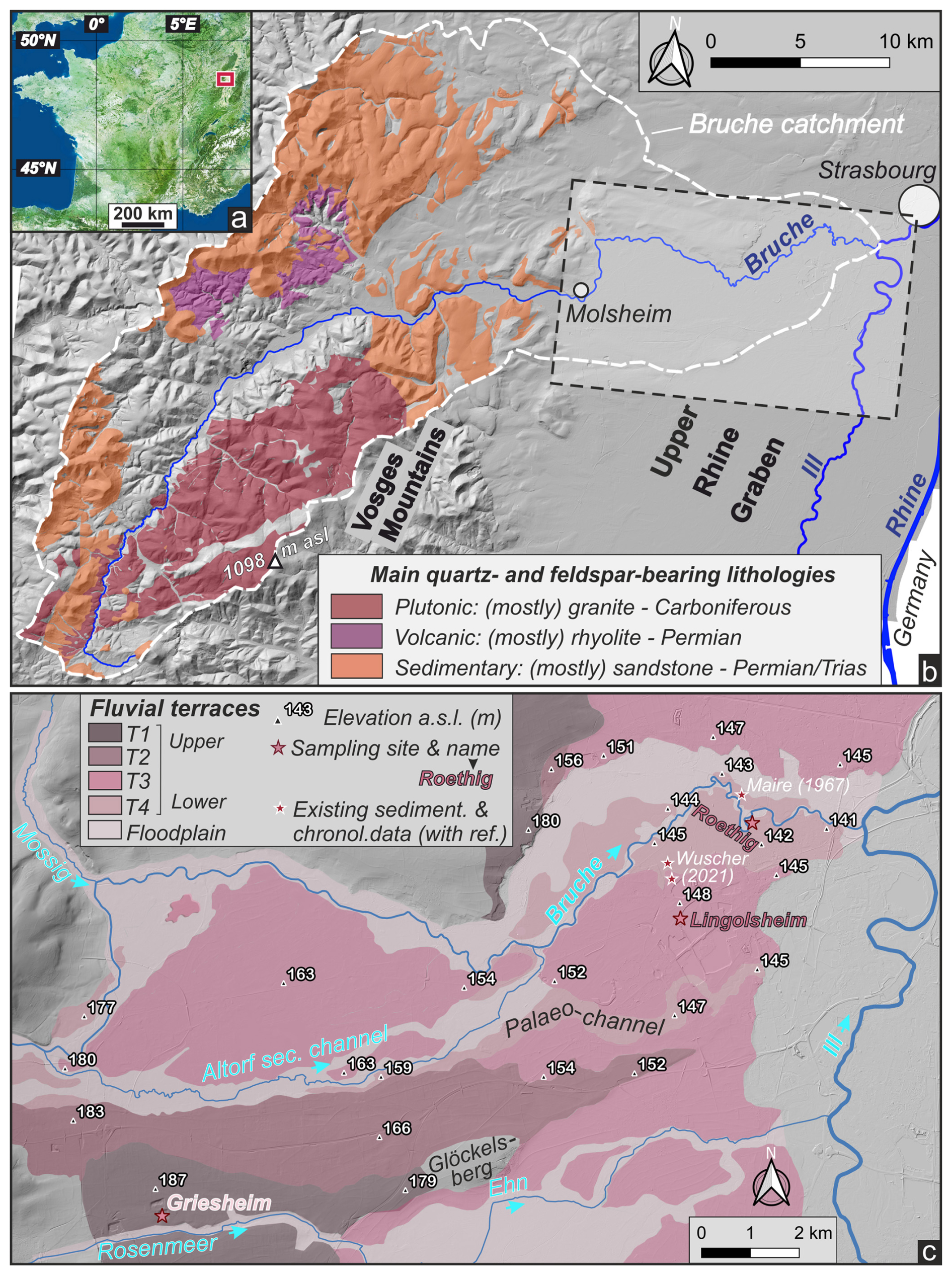 Figure 1(a) Location of the study area in north-eastern France. (b) Simplified lithological map of the Bruche catchment in the Vosges Mountains. Only the main quartz- and feldspar-bearing lithologies delivering sandy material are represented. The dashed rectangle in the lower section of the river delimits the study area presented in panel (c). (c) River terrace map (T4 to T1) of the lower Bruche. Fluvial morpho-sedimentary units after Maire (1966) with their spatial extension slightly adapted to topography where necessary. Stars with white and red borders refer to existing sedimentological and/or chronological data in the area and sampled terrace deposits, respectively.