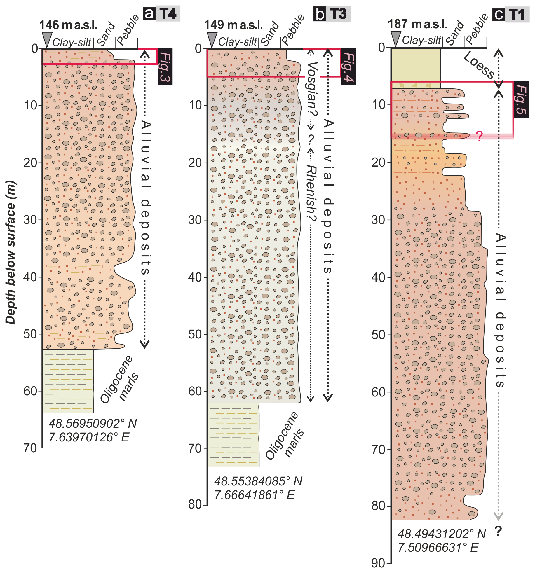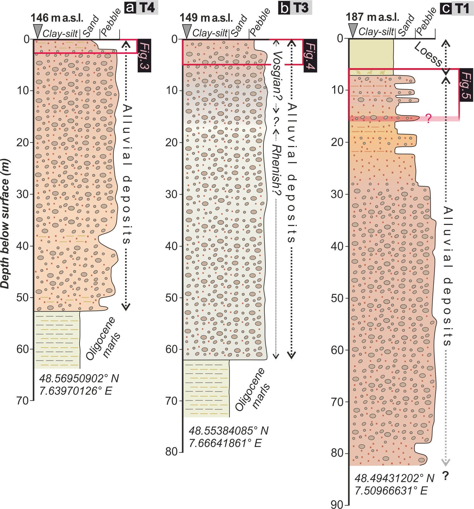 Figure 2Stratigraphic log of terrace deposits located in the vicinity of each sampling site in T4, T3, and T1. Red rectangles refer to the depth and thickness of sediments exposed in each sampling site (see details in Fig. 3). Logs are drawn according to drilling reports available from the subsurface database of the French Geological Survey (https://infoterre.brgm.fr/viewer/MainTileForward.do). The different colours of the alluvial deposits are related to the different provenances of the sediment: greyish to light-beige material points towards a Rhenish origin, whereas brownish to reddish material indicates a Vosgian origin.