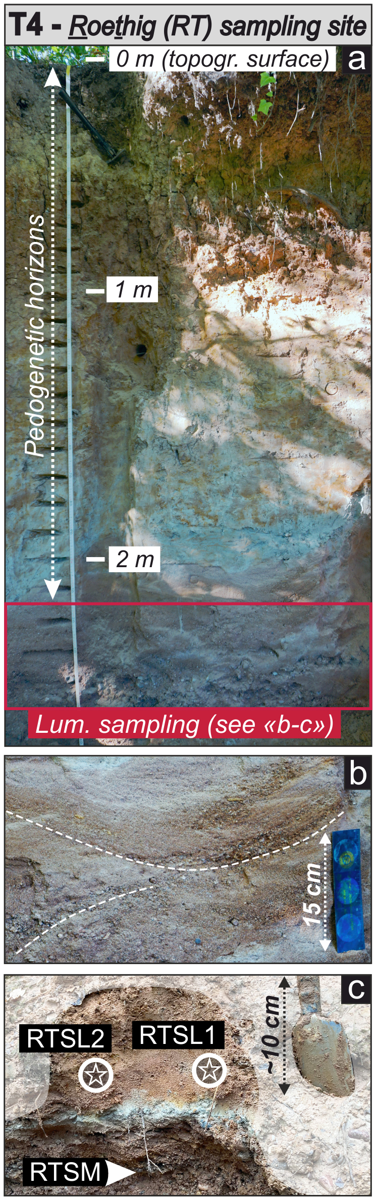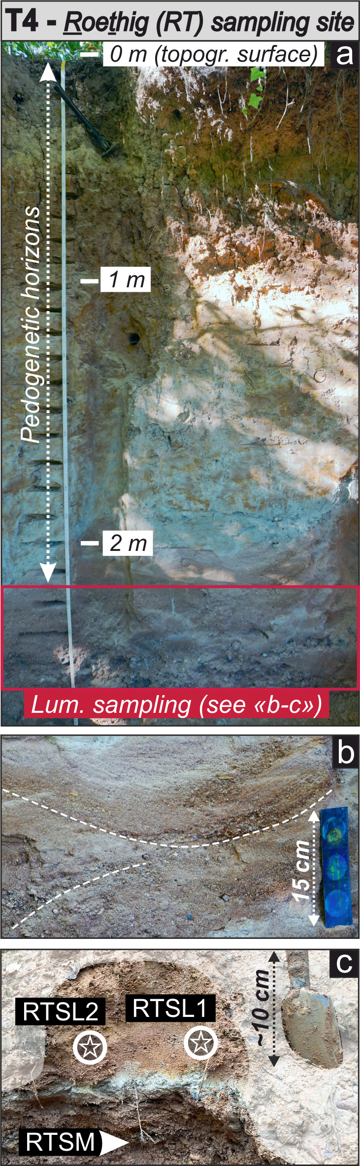 Figure 3Field characteristics of the Roethig (T4; a–c) sampling sites. The Roethig profile overview reveals pedogenesis in the upper ∼ 2 m, with cross-bedding occurring within the sampled layers (b). White stars within circles and arrows refer to luminescence samples collected in sandy layers and sandy matrix from clast-supported layers, respectively.