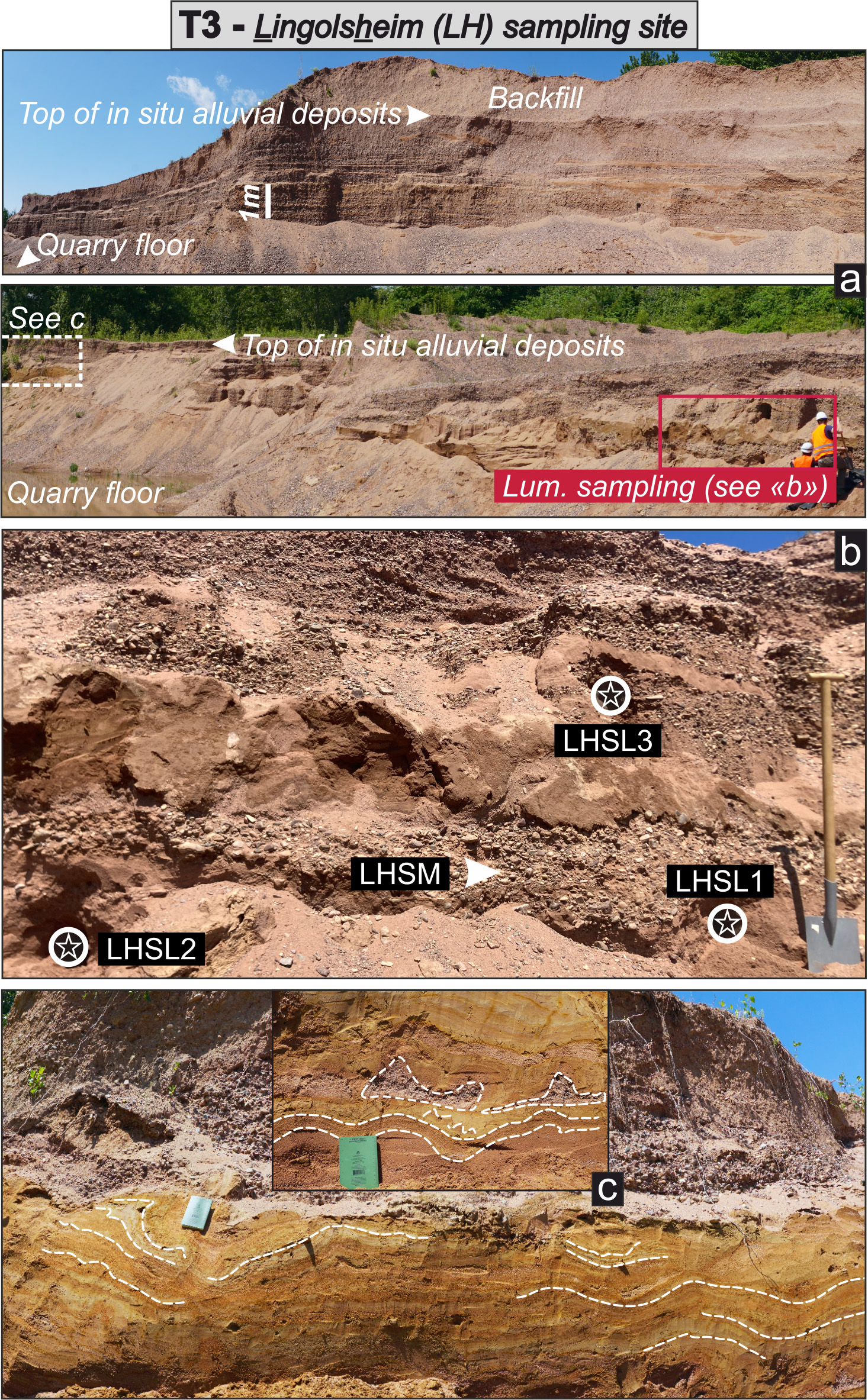 Figure 4Field characteristics of the Lingolsheim (T3) sampling sites. Panoramic views of the gravel pit at Lingolsheim (a), dominated by clast-supported layers, showing the sampling depth approximately halfway between the quarry floor and the top of alluvial deposits (vertical white segment ∼ 2.5 m below the topographic surface). Sampled layers sandwich fine-grained sediments showing cryoturbations (b) that are best visible at the pit's margin, where they affect various grain sizes ranging from silt to gravel (c). White stars within circles and arrows refer to luminescence samples collected in sandy layers and sandy matrix from clast-supported layers, respectively.
