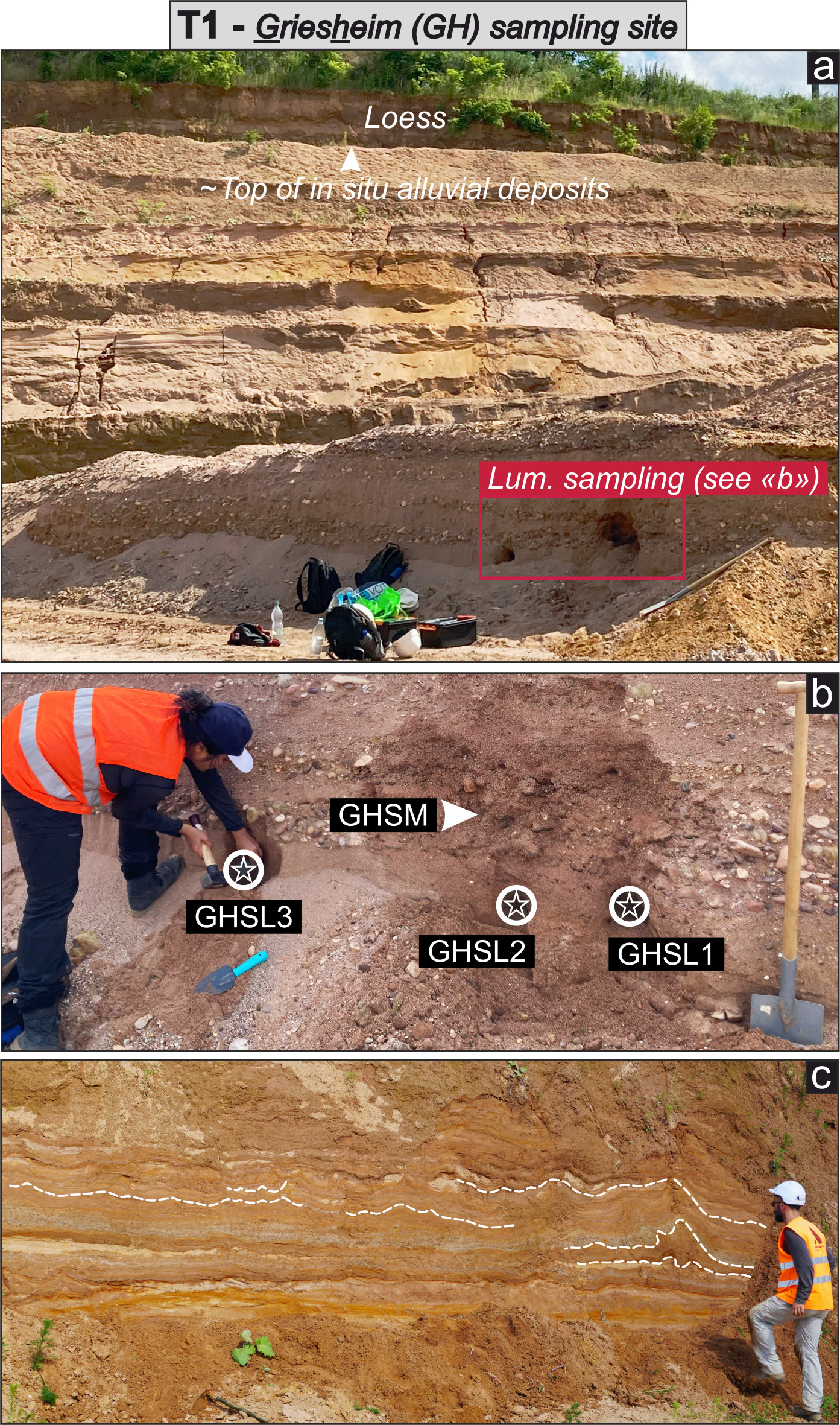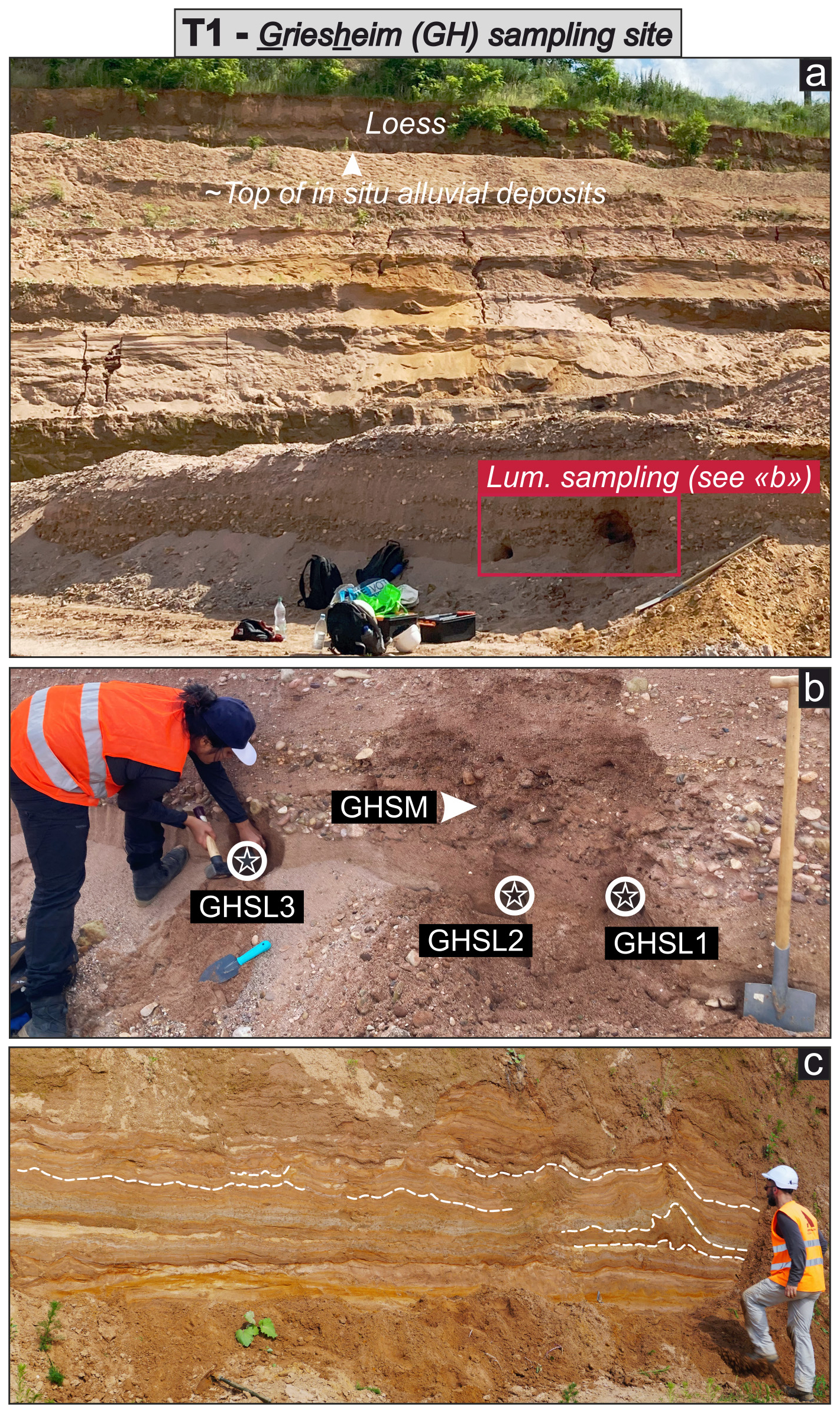 At Roethig, the ∼ 2.6 m high fining upward sequence evolves from clast- and sand-supported layers at the base to silty/loamy material at the top (Fig. 3a). In the former, brown to reddish sandy material displaying channel structures contrasts with the assorted pedogenetic horizons developed in the latter (Fig. 3a). Two sand samples (RTSL1 and RTSL2) and one sandy matrix sample (RTSM) were collected from a sand lens and a gravel layer located at depths of ∼ 2.2 and ∼ 2.5 m below the topographic surface, respectively (Fig. 3). In the Lingolsheim gravel pit, clast-supported layers largely prevail along the ∼ 5 m high sediment exposure (Fig. 4a). They are interspersed with secondary brown sandy layers and sand lenses. Two sand samples (LHSL1 and LHSL2) and one sandy matrix sample (LHSM) were collected from a sand lens and a gravel layer located at a depth of ∼ 2 m below the visible top of in situ alluvial deposits in the pit (Fig. 4b). A third sand sample (LHSL3) was collected from a sand layer located ∼ 0.5 m above the previous ones. Decimetric deformation structures are particularly conspicuous in sandy/loamy layers at the western margin of the quarry (Fig. 4c), but they also occur in a thin sandy layer (not sampled) sandwiched between our samples. The Griesheim gravel pit exhibits at least 8 m of sediments: fluvial deposits are overlain by up to 1.5–2 m thick loess cover (Fig. 5a). Clast-supported layers are not as prevalent as in the previous outcrop, and brown to reddish/orange sandy layers or lenses regularly occur as well. Three sand samples (GHSL1, GHSL2, and GHSL3) and one sandy matrix sample (GHSM) were collected from a sand layer and a coarse gravel horizon located ∼ 8 m below the topographic surface (Fig. 5a–b). Similarly to at the Lingolsheim pit, decimetric deformation structures were observed in > 1 m thick sandy/loamy layers located near the bottom of the quarry (Fig. 5c; roughly at the same depth as the sampled layers). Finally, two sandy samples were collected from the modern riverbed of the Bruche (MOD1 and MOD2), directly downstream of the Roethig outcrop (Fig. 1c). Approximately 10 g of sand was collected at depths of ∼ 0.1 cm (MOD1, finer sand) and ∼ 3–4 cm (MOD2, coarser sand) below the surface of the exposed sandy bar. Samples were immediately transferred into black plastic bags to avoid sunlight exposure.