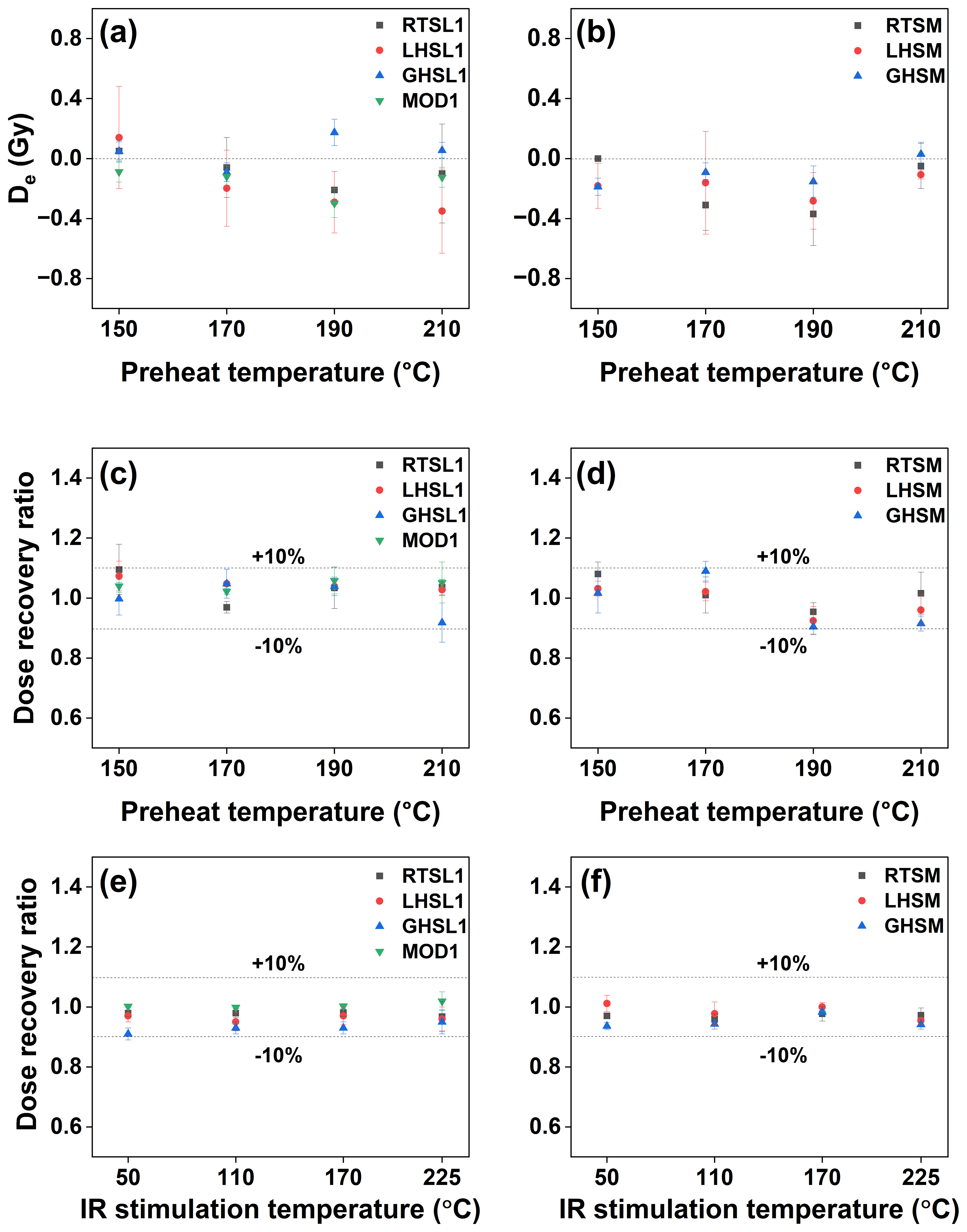 Figure 6Results of protocol performance tests performed on bleached quartz and feldspar aliquots from modern samples, as well as from sand and matrix samples from the three fluvial terraces. Panels (a) and (b) present the results from thermal transfer tests performed at different preheat temperatures on quartz grains of sand samples and modern sand (a) and of matrix samples (b). Dose recovery test results from quartz grains are shown by panels (c) and (d), derived from sand samples and modern sand (c) and from matrix samples (d), respectively. Results of dose recovery tests conducted on feldspar grains at different IR stimulation temperatures are shown for sand samples and modern sand (e) and for matrix samples (f). Individual data points of each panel represent the mean value obtained from three aliquots for each sample, and corresponding error bars indicate the standard deviation. Note that only representative performance test results of samples RTSL1, LHSL1, GHSL1, and MOD1 are shown in this figure; other sand samples (RTSL2, LHSL2, LHSL3, GHSL2, and GHSL3) as well as another modern sand sample (MOD2) produced similar results, which are not presented to improve readability of this figure.