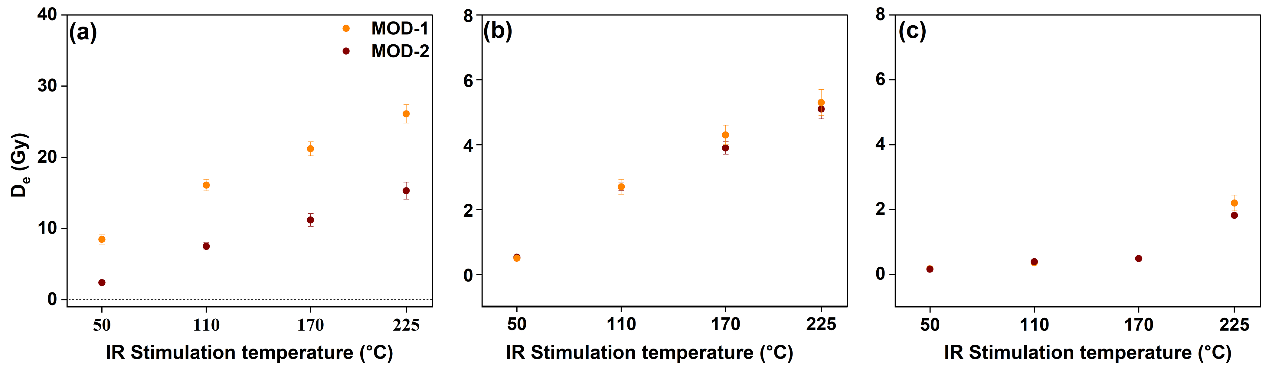Figure 7Residual De values measured on non-bleached and bleached feldspar aliquots of modern sand samples at different IR stimulation temperatures. (a) Residual De values obtained on non-bleached feldspar aliquots, (b) residual De values obtained after bleaching under sunlight for ∼ 10 d, and (c) residual De values obtained after three consecutive steps of blue LED exposure within the Risø reader at 225 °C for 65 s. Each data point in panels (a), (b), and (c) represents a CAM De value.