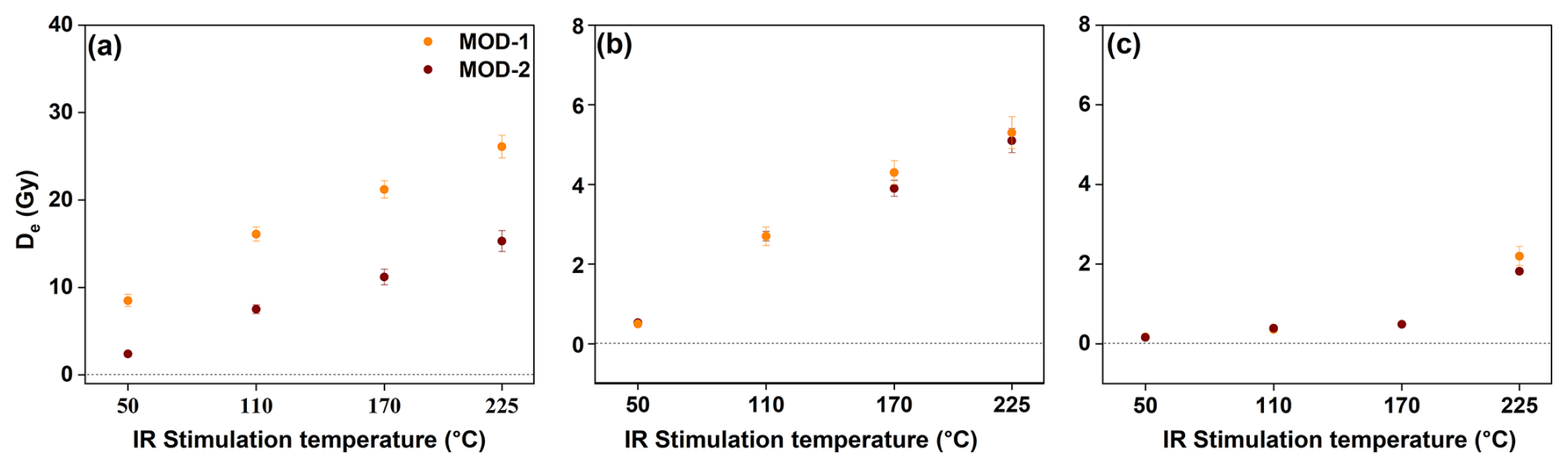 On a related note, this study underscores the importance of reliable estimation of the fading rate and resulting fading-corrected ages. While the fading rates were derived using a maximum delay time of 3 h for all the fading measurements conducted within this study, it is acknowledged that shorter delay times (∼ 3 h) may potentially influence the fading rate estimation. To assess this, an additional fading test extending the maximum delay time to 24 h for one representative sample RTSL1 was conducted, and it showed minor differences in fading rates and had a negligible impact on the fading-corrected ages (Table S5 and Fig. S6). Despite this consistency, the limitations inherent to the use of a shorter delay time (≤ 3 h) are noted in this study, and it is recommended for future studies to systematically evaluate the impact of delay times to better constrain fading behaviour across a wider range of sample types and geological contexts.