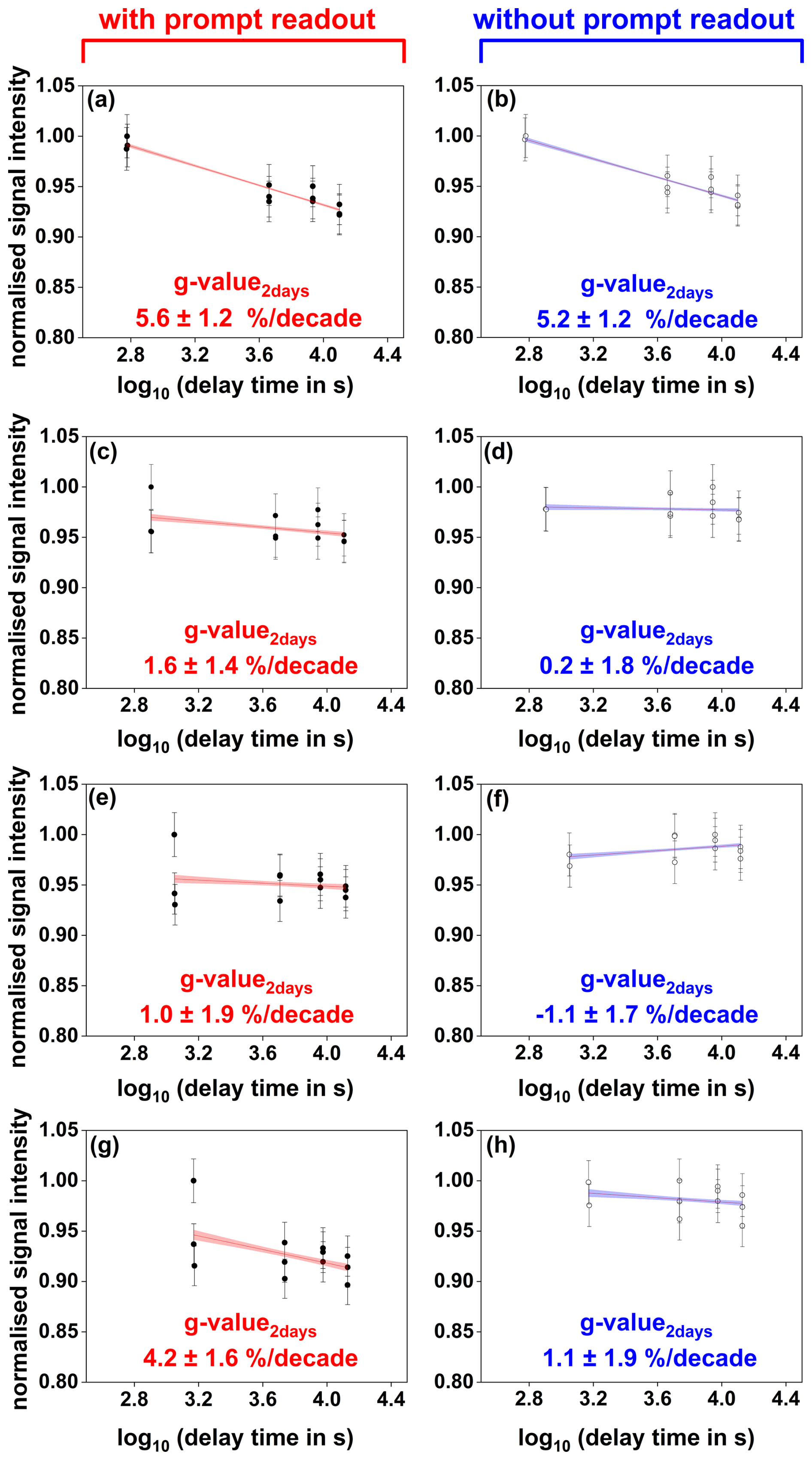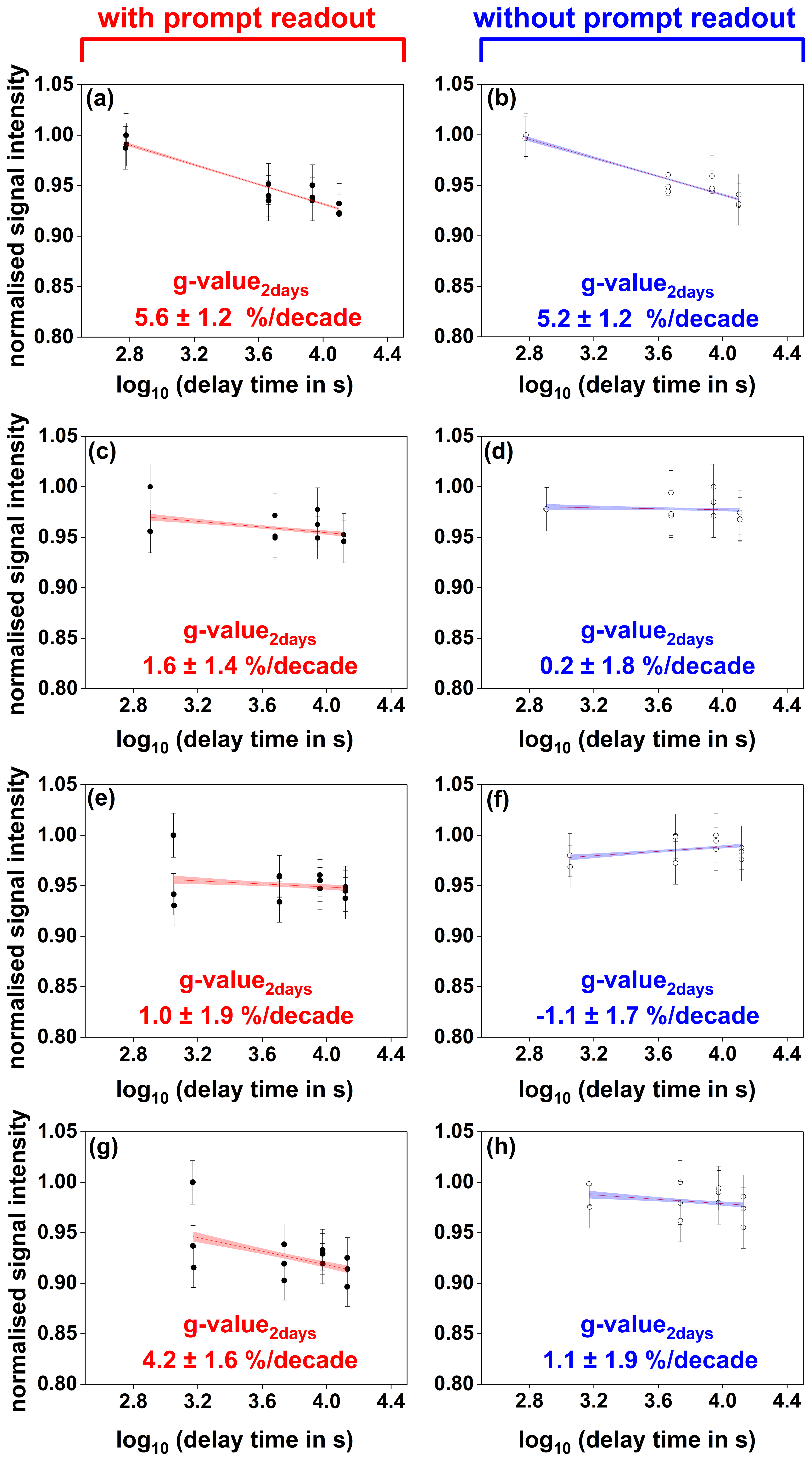 Figure 8Anomalous fading measurements obtained for different IR stimulation temperatures with or without including the first prompt measurement. Shown are the results of a representative aliquot of sample RTSL1. Normalised signal intensities are plotted as a function of time since irradiation for IR50 (a, b), pIR110 (c, d), pIR170 (e, f), and pIR225 (g, h) stimulations. Panels (a), (c), (e), and (g) show the linear regression and corresponding fading rates (g-value2 d) obtained including all signal readouts measured at different delay times, while panels (b), (d), (f), and (h) exclude the first prompt measurement. Fading rates were calculated using the analyse_FadingMeasurement function of the R package “Luminescence” version 0.9.23 (Kreutzer et al., 2012).