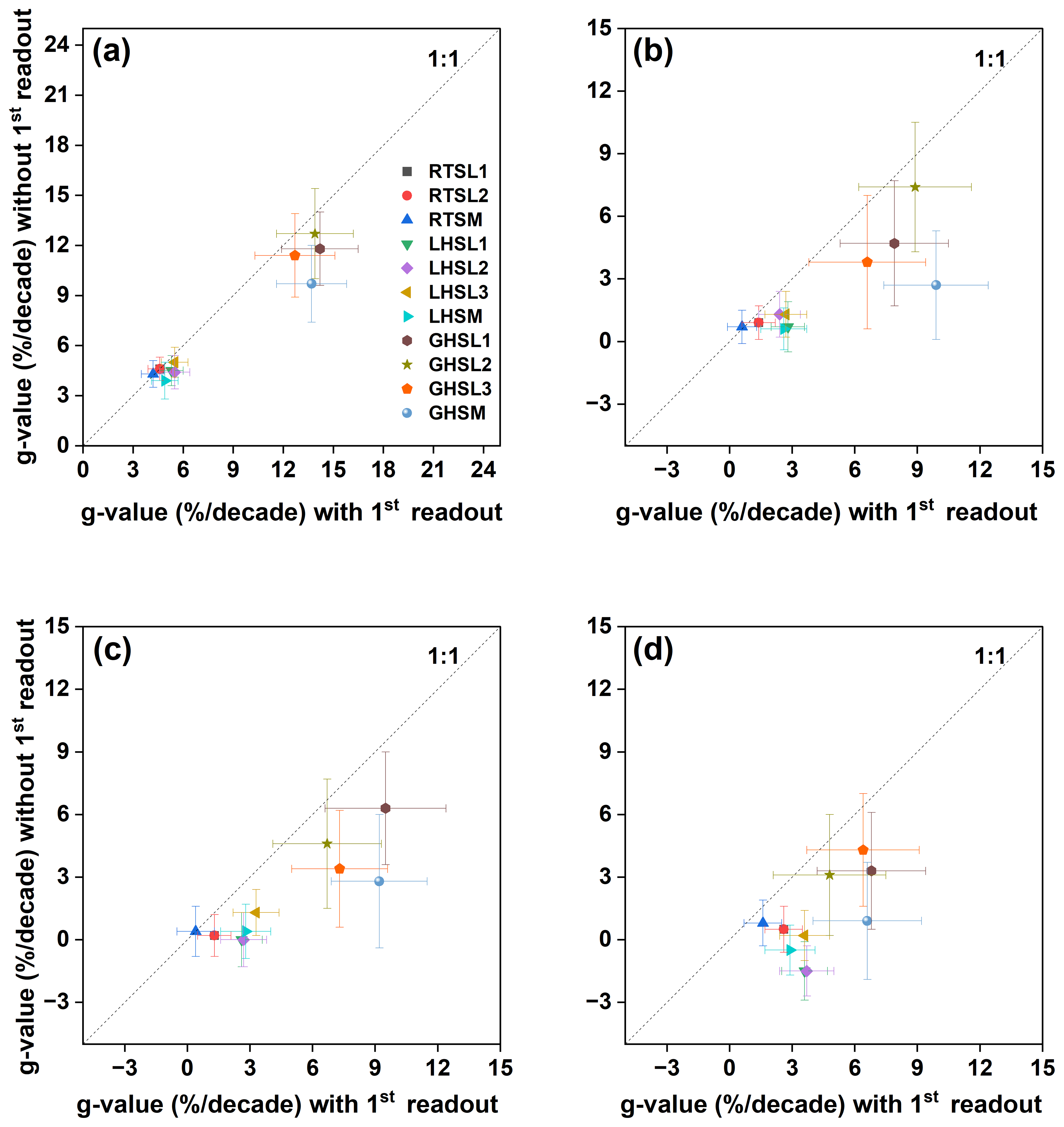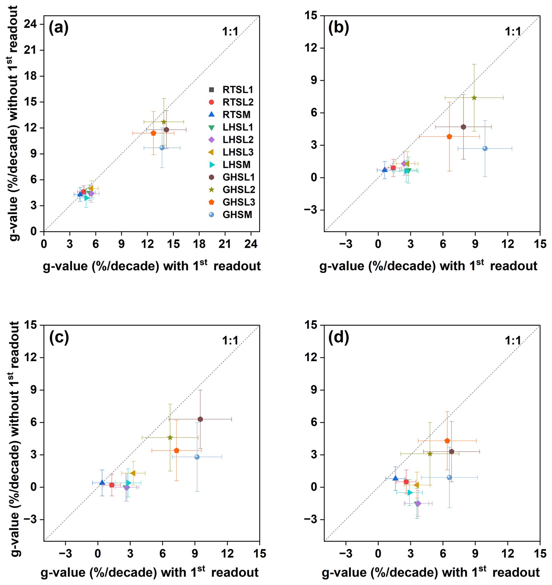 Figure 9Comparison of fading rates obtained with or without including the first prompt luminescence measurement. g-value2 d results calculated by combining the fading measurements of three aliquots per sample are shown for the different IR stimulation temperatures: (a) IR50, (b) pIR110, (c) pIR170, and (d) pIR225. For each sample, fading measurements from three aliquots were combined into a single dataset comprising delay time (s), normalised signal (), and signal-associated errors. The combined dataset was used to calculate a single g-value2 d using the R package “Luminescence” version 0.9.23. To assess the fading rate without prompt measurements, the prompt data points were manually removed from each aliquot's fading dataset, and based on the remaining data, g-value2 d was recalculated.