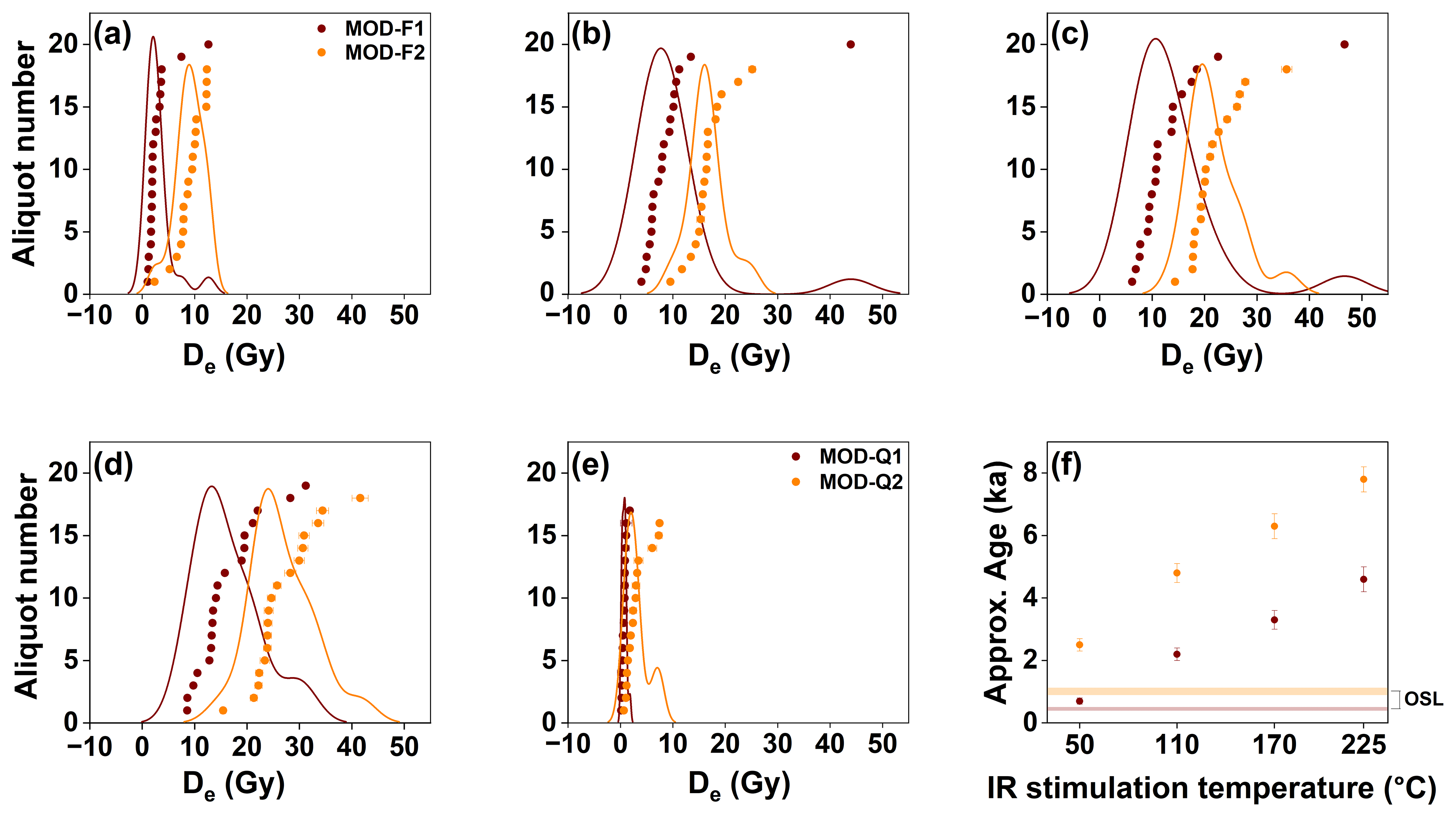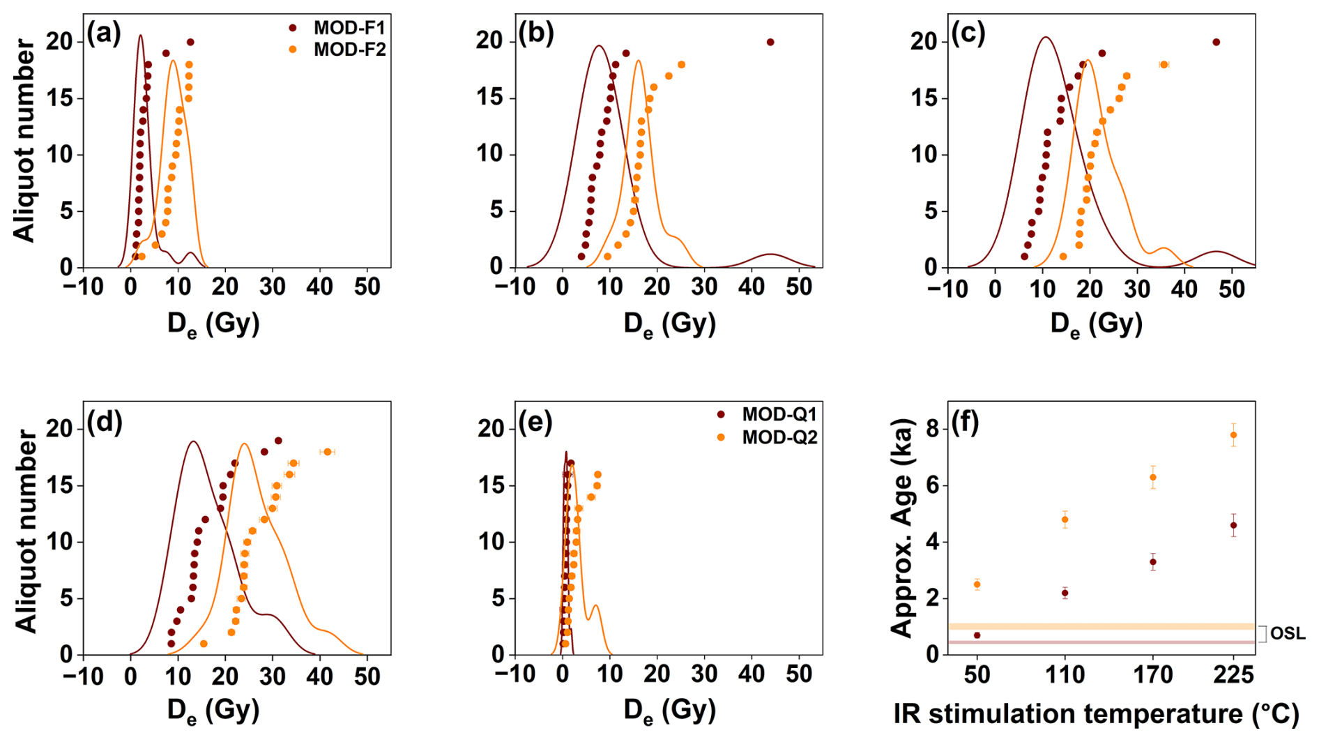 Figure 10Luminescence dating results for the two modern riverbed sand samples (MOD1, MOD2). (a–d) Feldspar MET-pIRIR De distributions for the IR50, pIR110, pIR170, and pIR225 signals. (e) Quartz OSL De distributions. (f) Comparison between quartz and feldspar approx. age estimates (i.e. calculated with dose rate from RTSL1). Each data point in panel (f) represents approx. IRSL and post-IRSL CAM ages from MOD1 and MOD2. Corresponding approx. OSL ages are shown by transparent colour bars with the same colour scheme; the height of each colour bar indicates the 1σ uncertainty associated with the corresponding OSL age.