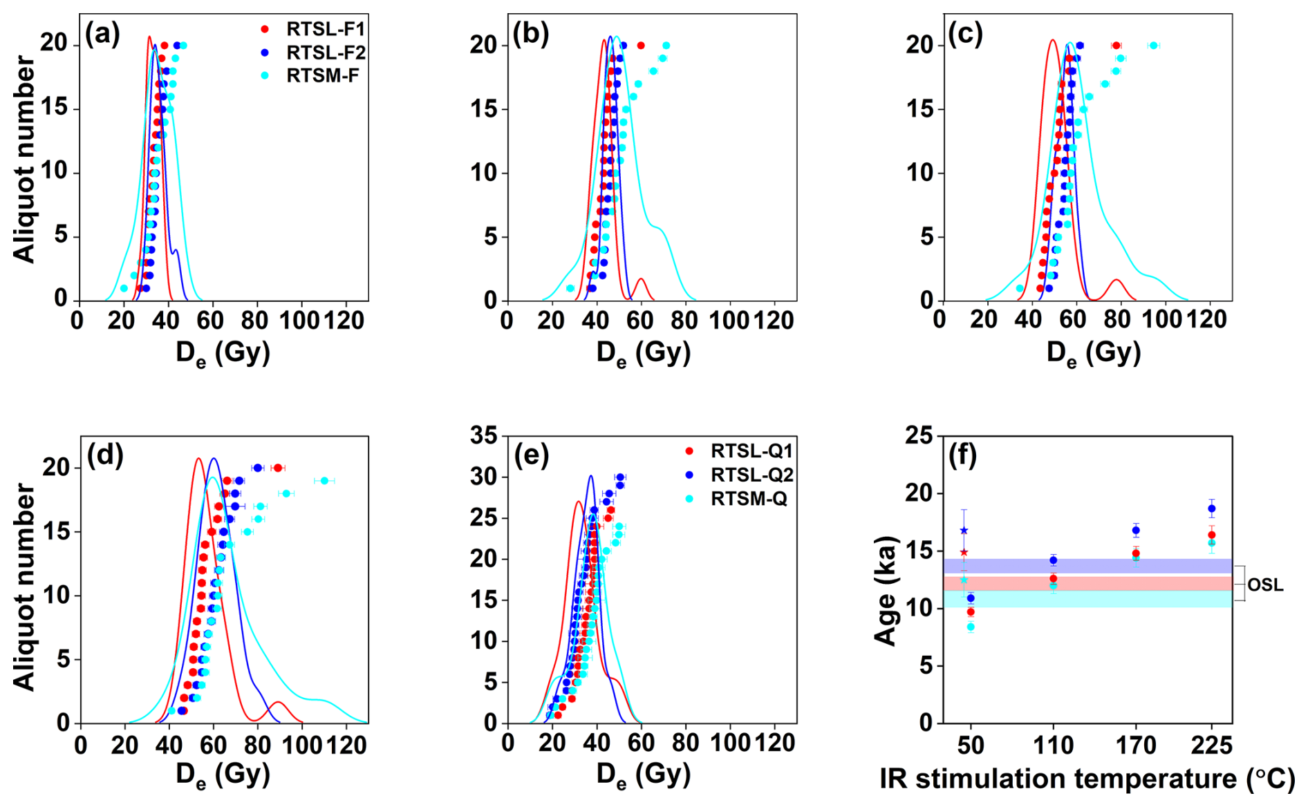 Figure 11Luminescence dating results for sand and matrix samples from the Roethig terrace (RTSL1, RTSL2, and RTSM). (a–d) MET-pIRIR De distributions for IR50, pIR110, pIR170, and pIR225 signals. (e) Quartz OSL De distributions. (f) Comparison between quartz and feldspar ages of samples RTSL1, RTSL2, and RTSM. Each data point represents the non-fading-corrected feldspar CAM age at different IR stimulation temperatures. Additionally, fading-corrected IR50 ages are shown with star symbols. OSL ages are shown as transparent colour bars with the same sample colour scheme; the height of each colour bar indicates the 1σ uncertainty associated with the corresponding OSL age.