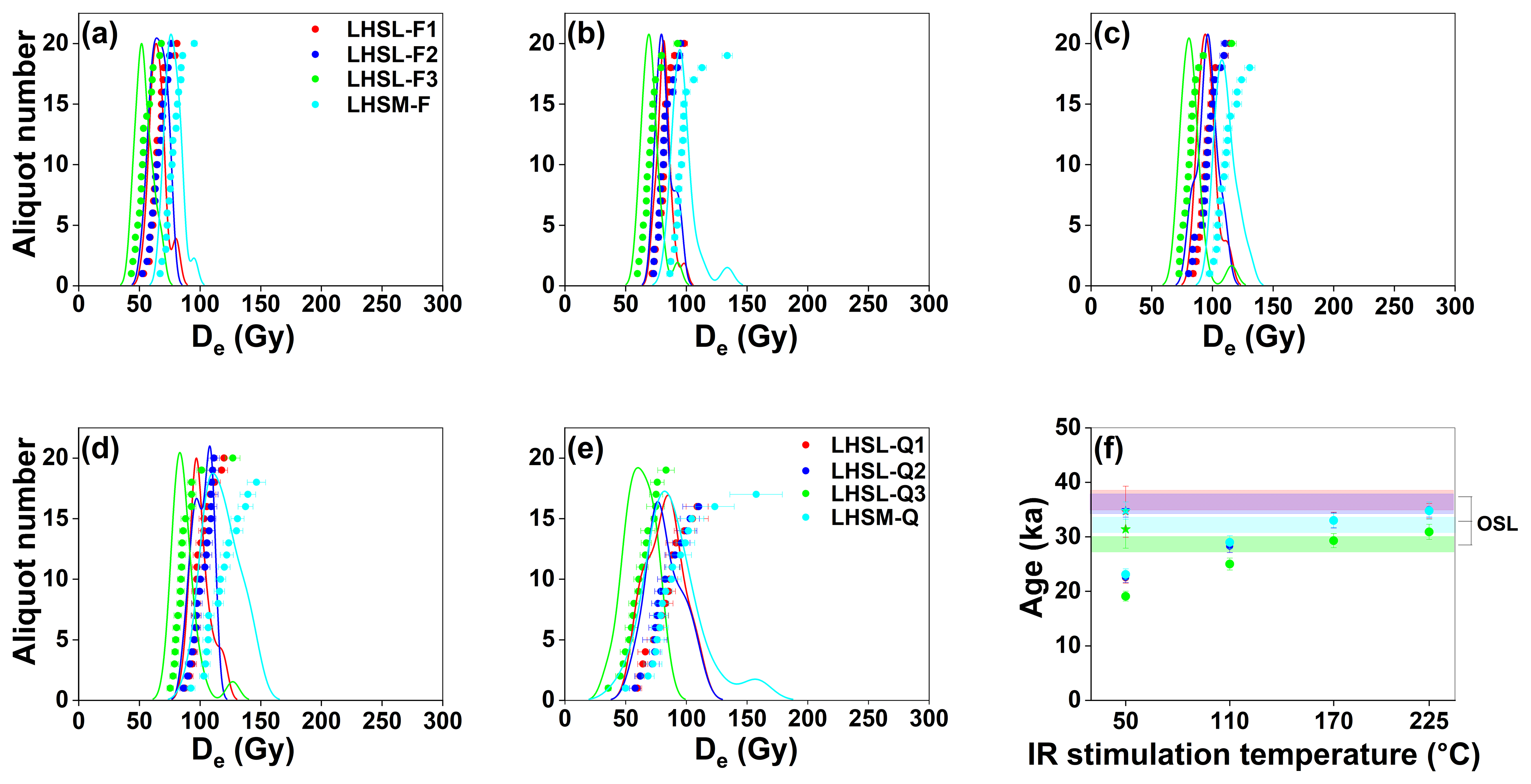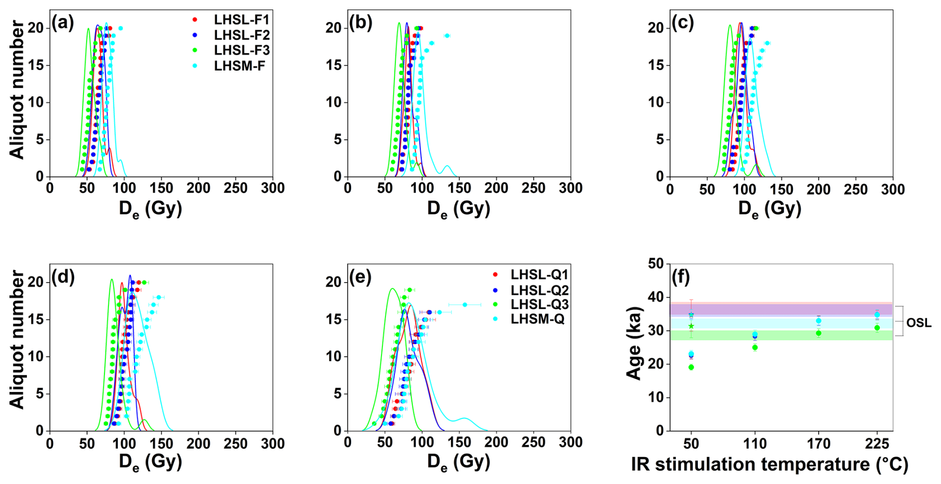 Figure 12Luminescence dating results for sand and matrix samples from the Lingolsheim terrace (LHSL1, LHSL2, LHSL3, and LHSM). (a–d) Feldspar MET-pIRIR De distributions for IR50, pIR110, pIR170, and pIR225 stimulations. (e) Quartz OSL De distributions. (f) Comparison between quartz and feldspar ages of samples LHSL1, LHSL2, LHSL3, and LHSM. Each data point represents the non-fading-corrected feldspar CAM age at different IR stimulation temperatures. Additionally, fading-corrected IR50 ages are indicated by star symbols. OSL ages are shown as transparent colour bars with the same sample colour scheme; each colour bar indicates the 1σ uncertainty associated with the corresponding OSL age.