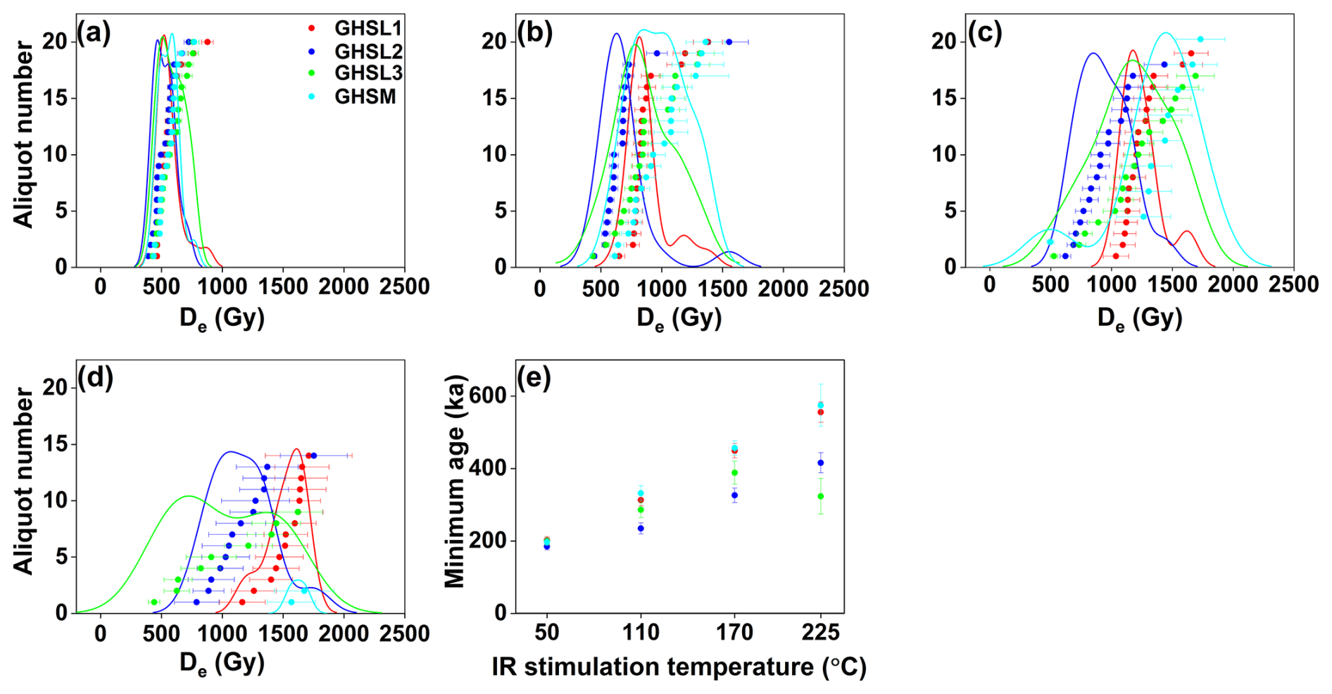Figure 13Luminescence dating results for the sand and matrix samples from the Griesheim terrace (GHSL1, GHSL2, GHSL3, and GHSM). (a–d) Feldspar MET-pIRIR De distributions for IR50, pIR110, pIR170, and pIR225 stimulations. (e) Feldspar ages without fading correction at different IR stimulation temperatures. Each data point represents ages estimated using CAM, except for the pIR225 age of sample GHSM, for which an arithmetic mean was calculated from the only two aliquots that met the routine rejection criteria (d). OSL measurements on sand and matrix samples from Griesheim terrace showed significant signal saturation. Therefore, no reliable OSL age has been retrieved from this terrace.