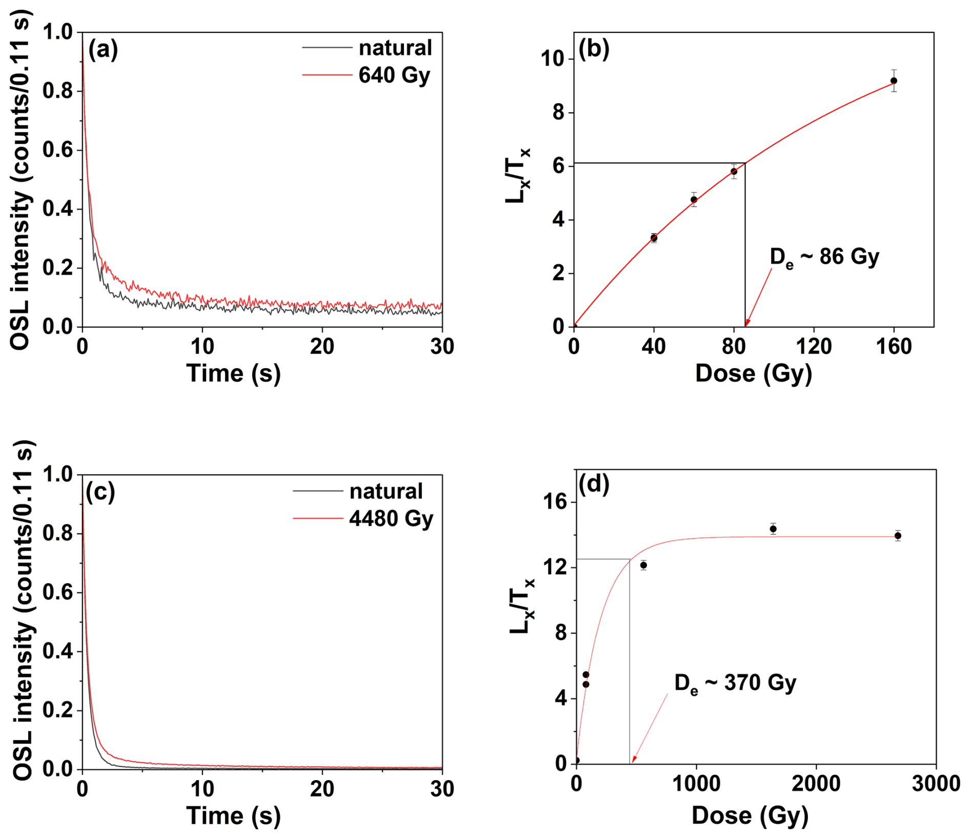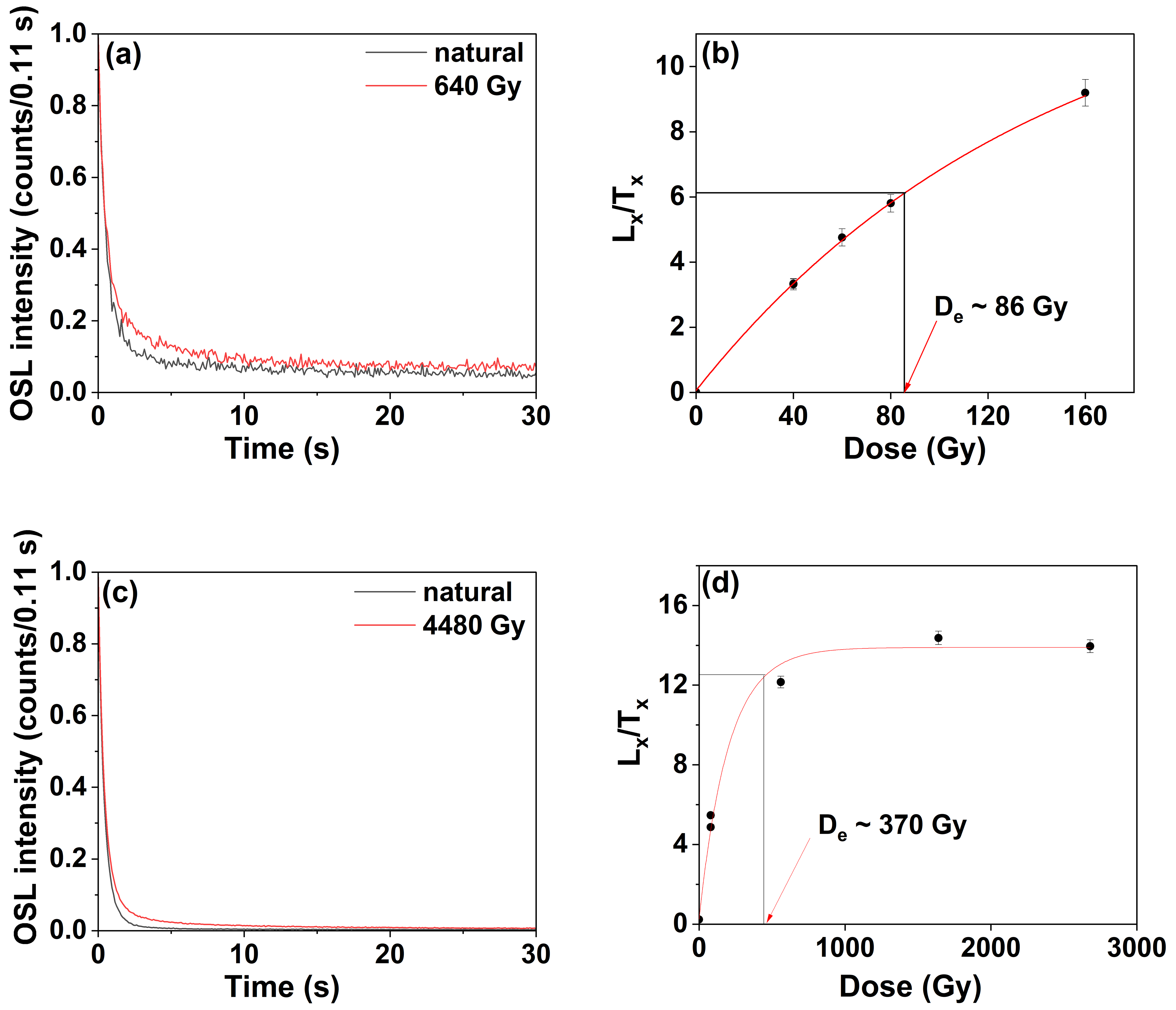 Figure 14Normalised quartz OSL decay curves and sensitivity-corrected dose response curves (DRCs). Examples of two representative aliquots from samples LHSL1 (a, b) and GHSL1 (c, d) are shown. DRCs in panels (b) and (d) are fitted with a single saturation exponential function. OSL measurements on sand and matrix samples from the Griesheim terrace show signal saturation.