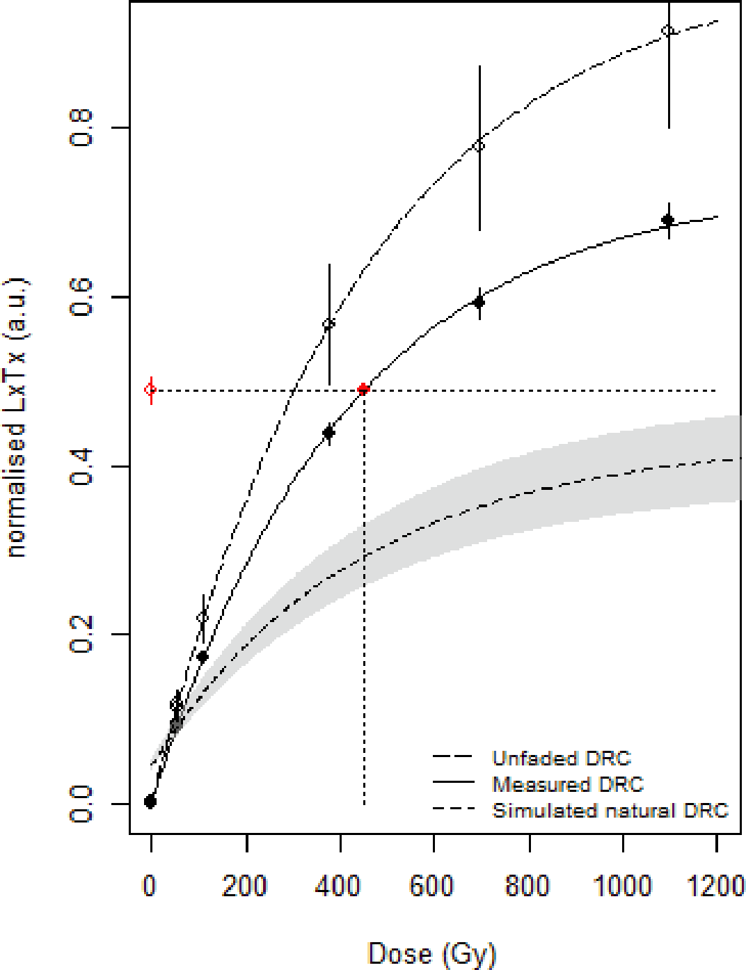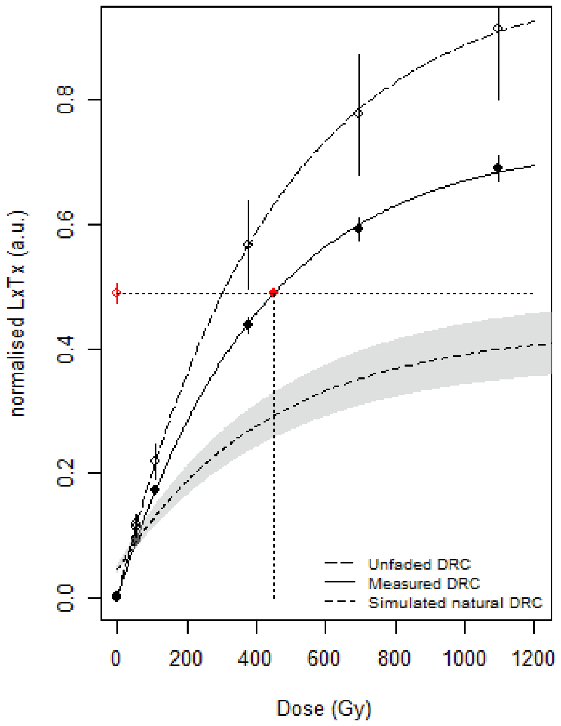 Figure 15Laboratory-measured, simulated unfaded and simulated natural dose response curves for the IR50 signal of one representative aliquot of sample GHSL1. The curves were obtained using the calc_Huntley2006 function of the R package “Luminescence” (King and Burow, 2019) fitted with a single saturation exponential following Kars et al. (2008). (sensitivity-corrected natural signal) does not interpolate the simulated natural DRC, highlighting that the fading correction is unable to produce a finite fading-corrected De value for the samples from the Griesheim terrace.