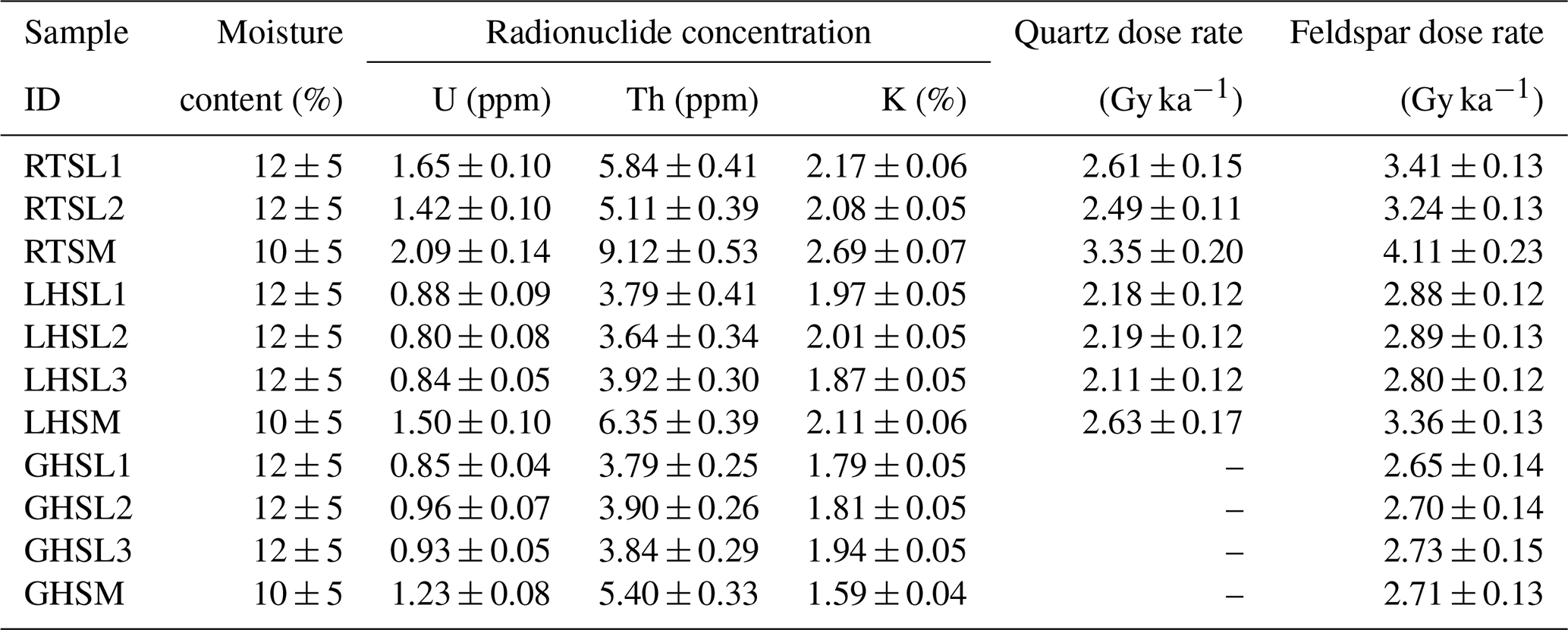 Radionuclide concentrations measured on the three samples are reported in Table 2. The matrix sample (RTSM) shows slightly higher radionuclide concentrations, resulting in quartz (3.4 ± 0.2 Gy ka−1) and feldspar (4.1 ± 0.2 Gy ka−1) dose rates that are approximately 25 % higher than those of the sand lens samples (quartz: ∼ 2.5–2.6 Gy ka−1; feldspar: ∼ 3.2–3.4 Gy ka−1).