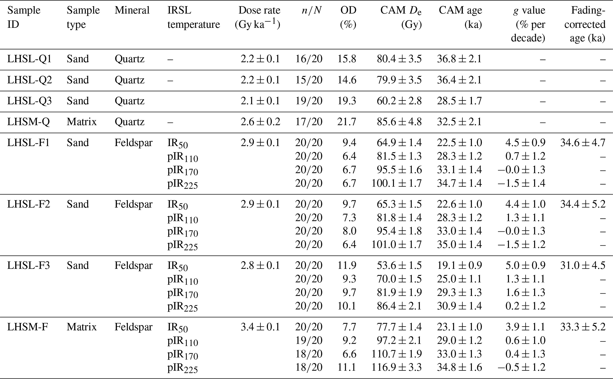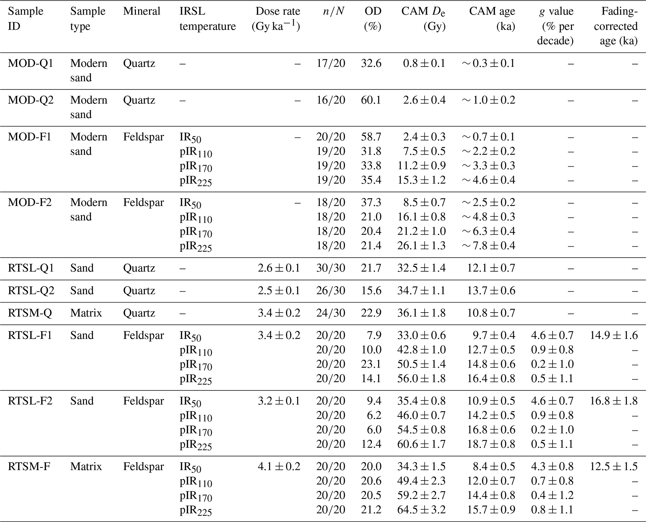Feldspar fading rates (g2 d) estimated after excluding the first prompt measurement (see Sect. 3.4) are reported in Table 3. While significant fading rates were measured for the IR50 signal of all three samples (∼ 4.3 %–4.6 % per decade), the pIRIR signals exhibited much lower fading rates: ∼ 0.7 %–0.9 % per decade for pIR110, ∼ 0.2 %–0.5 % per decade for pIR170, and ∼ 0.5 %–0.8 % per decade for pIR225. According to earlier studies, a fading rate < 1.5 % per decade is considered negligible as it might result from measurement artefacts (e.g. Buylaert et al., 2012; Thomsen et al., 2008). Therefore, only the IR50 ages are corrected for fading (Thiel et al., 2011; Serra et al., 2025), while pIRIR fading-corrected ages (Table S1) are not considered further in the paper.