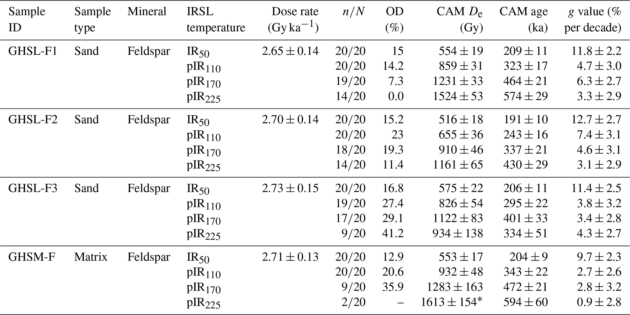 ∗ An average pIR225 De value and age are calculated for GHSM instead of calculating a CAM since only two feldspar aliquots met the routine rejection criteria.