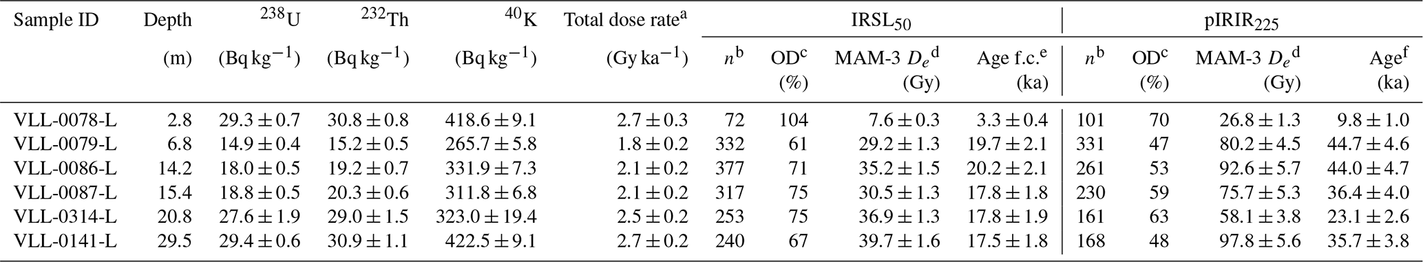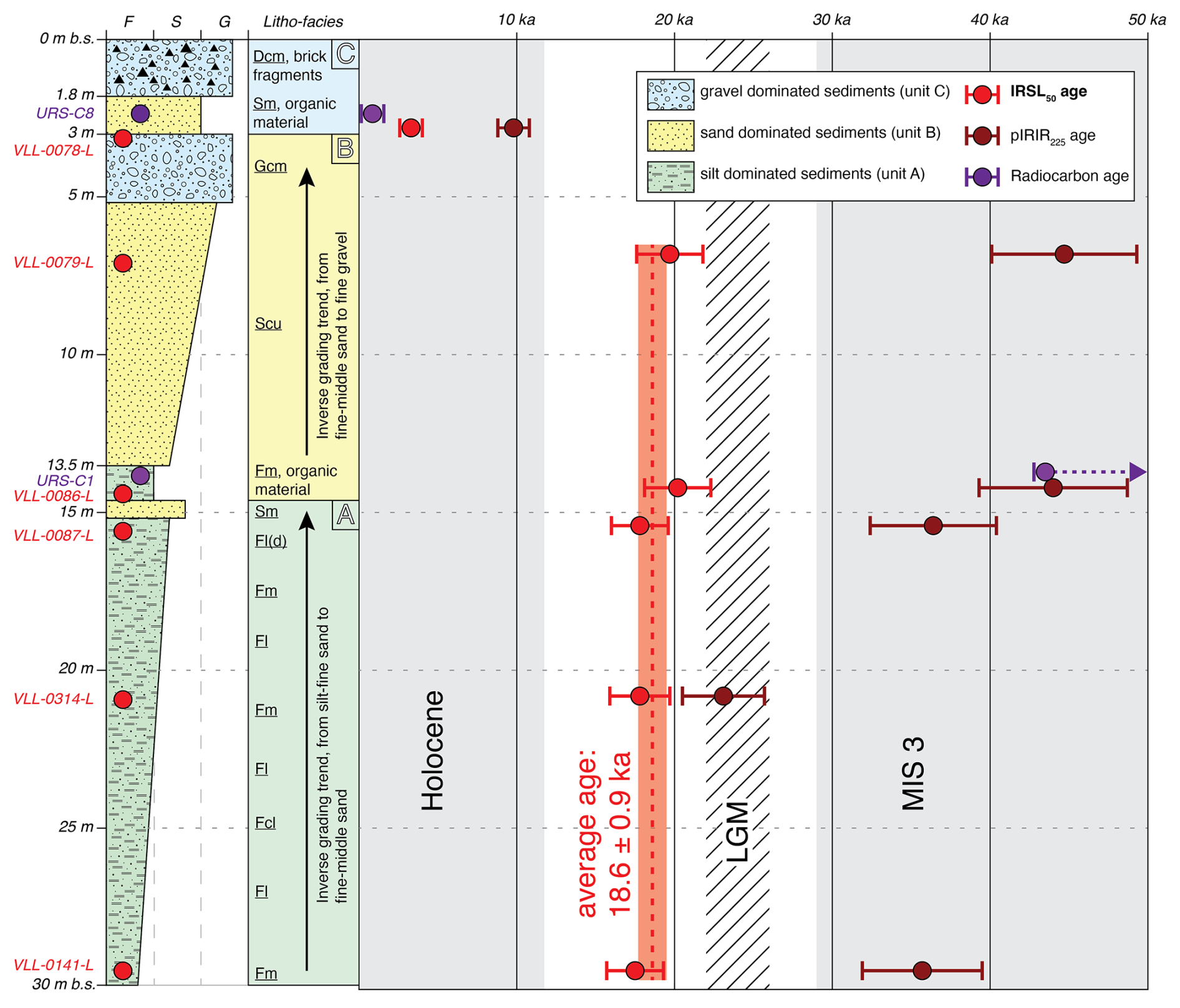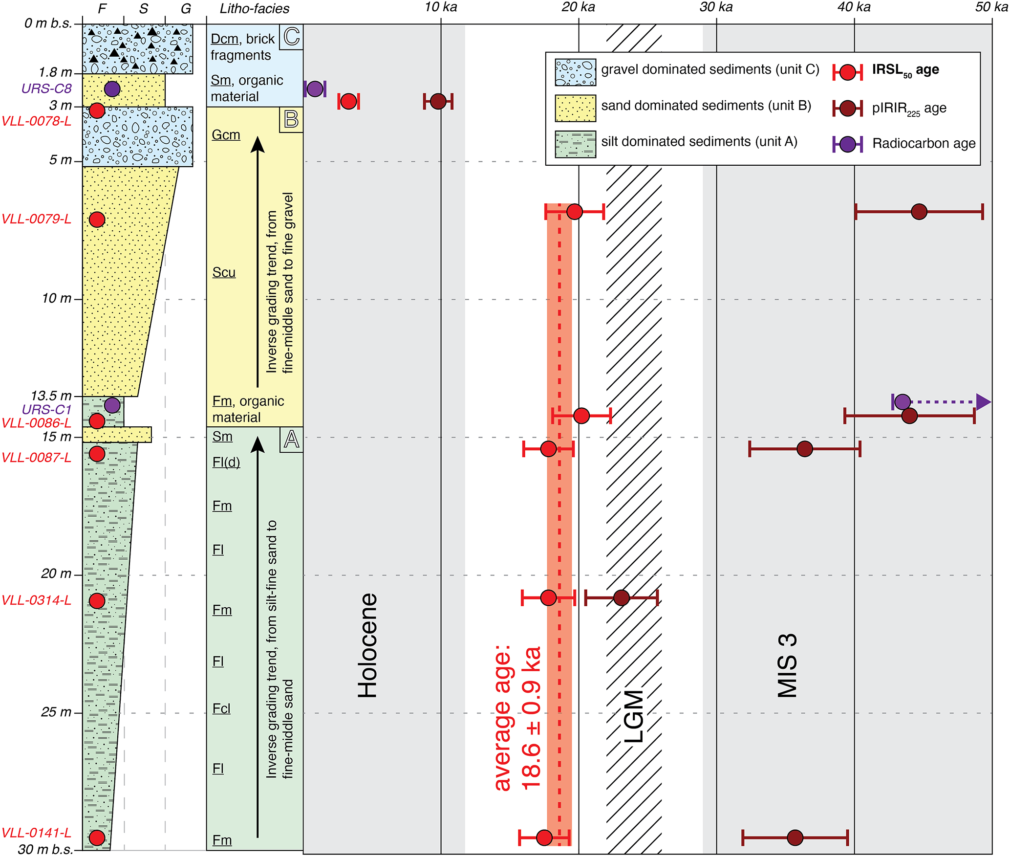 The ages of all samples show a significant offset between the IRSL50 and the pIRIR225 signal (Fig. 2). Assuming that fading correction is reliable, this can be explained by the different bleaching characteristics of the two signals. The IRSL50 signal is bleached faster compared to the pIRIR225 signal. Therefore, we consider the ages based on the fading-corrected IRSL50 signal to be the most reliable representation of the last depositional event. The following sections will focus on the IRSL50 ages if not explicitly mentioned otherwise. The ages can be subdivided into two age clusters representing two sedimentary phases. The bottom age cluster is comprised of VLL-0079-L, VLL-0086-L, VLL-0087-L, VLL-0314-L, and VLL-0141-L (unit A and unit B). The top section is represented by VLL-0078-L (unit C). The ages of the bottom age cluster all agree within uncertainty of each other. Because of the absence of an age trend from bottom to top, it can be inferred that the sedimentation of the SST occurred in a comparatively short time frame, with an average age of 18.6 ± 0.9 ka (calculated using the CAM; Galbraith et al., 1999). The calculated age in unit C represents Holocene deposition.
