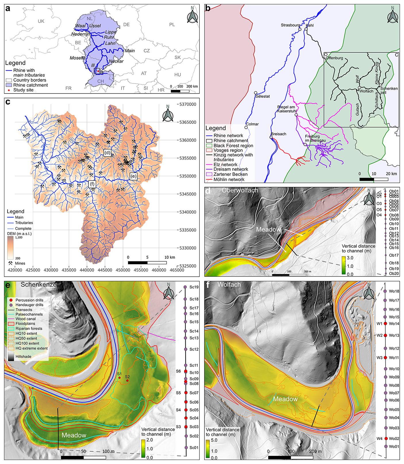 Figure 1Geographical setting of the study area. (a) Rhine catchment, including main tributaries and study area (rectangle). (b) Study region within the Black Forest, including tributaries and settlements. (c) Kinzig catchment, with stream network, elevation, field sites, and historical mining locations (sources: Fig. S10 in the Supplement). (d–f) Study sites with floodplain areas, including vertical distance to the current channel (m), transects with drill positions, location of palaeochannels, outline of riparian forests, HQ (flood) event extents, and location of wood canal. Transect lengths: 85 m (Schenkenzell), 78 m (Oberwolfach), and 142 m (Wolfach). The vertical distance along transects is given in Fig. 9. The coordinates of the field sites (e.g. drills, transects) are given in Table S1 in the Supplement. A geological map of the catchment is given in Fig. S1. The localisation of mined material is provided in Fig. S10 and Table S8.