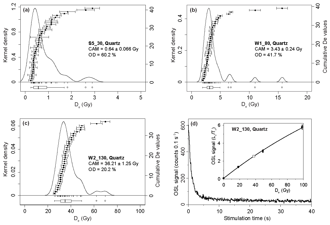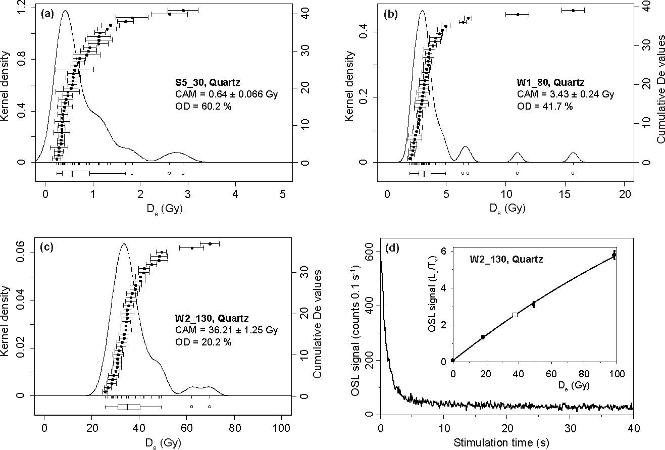 Figure 2(a–c) Examples of De distributions of three quartz samples of different ages. Note the right-skewed dose distributions of all samples that are typical for partial (differential) bleaching prior to deposition. Boxplots indicate the 1.5 interquartile range; aliquots within the whiskers are accepted in the applied MAM. (d) Example OSL decay curve and dose growth curve (empty square: natural and De). The relatively low luminescence intensity is typical for the samples investigated here.