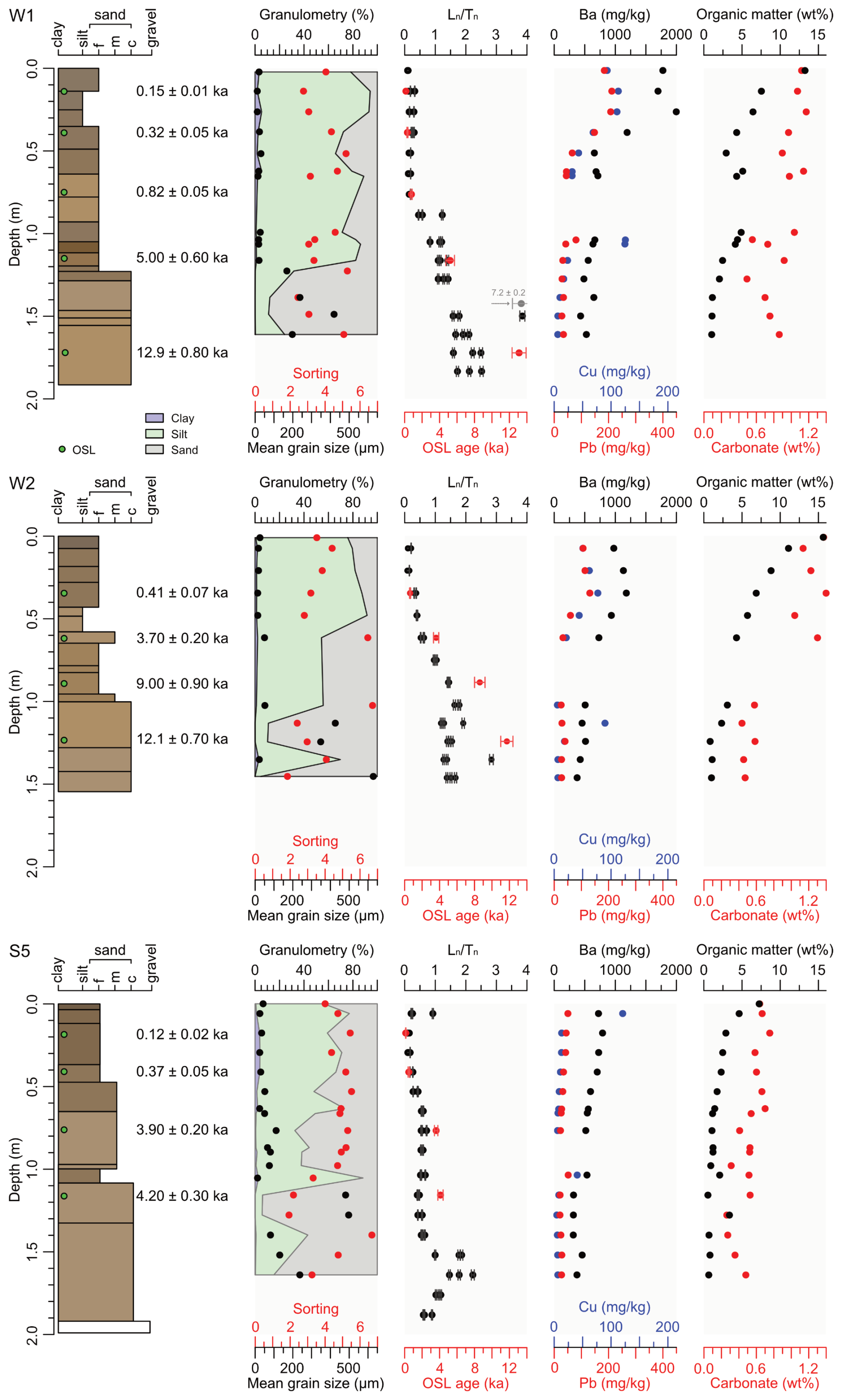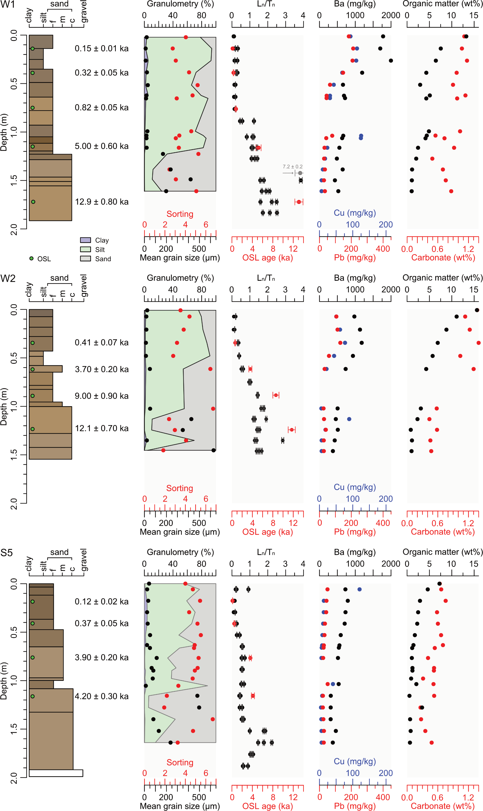 Figure 3Stratigraphic logs of the main cores, W1, W2 (Wolfach), and S5 (Schenkenzell), including layers shown in Munsell colours and the results of OSL dating. The columns display (from left to right) grain size distributions; values (black) and OSL ages (red); concentration of Ba (black), Pb (red), and Cu (blue); and the wt % of both OM and carbonate. The high value at 1.39 m depth in W1 likely represents partial bleaching related to a flood event.