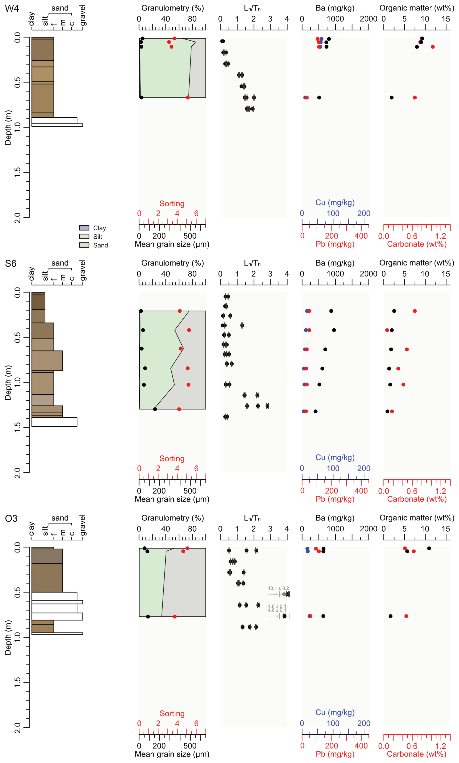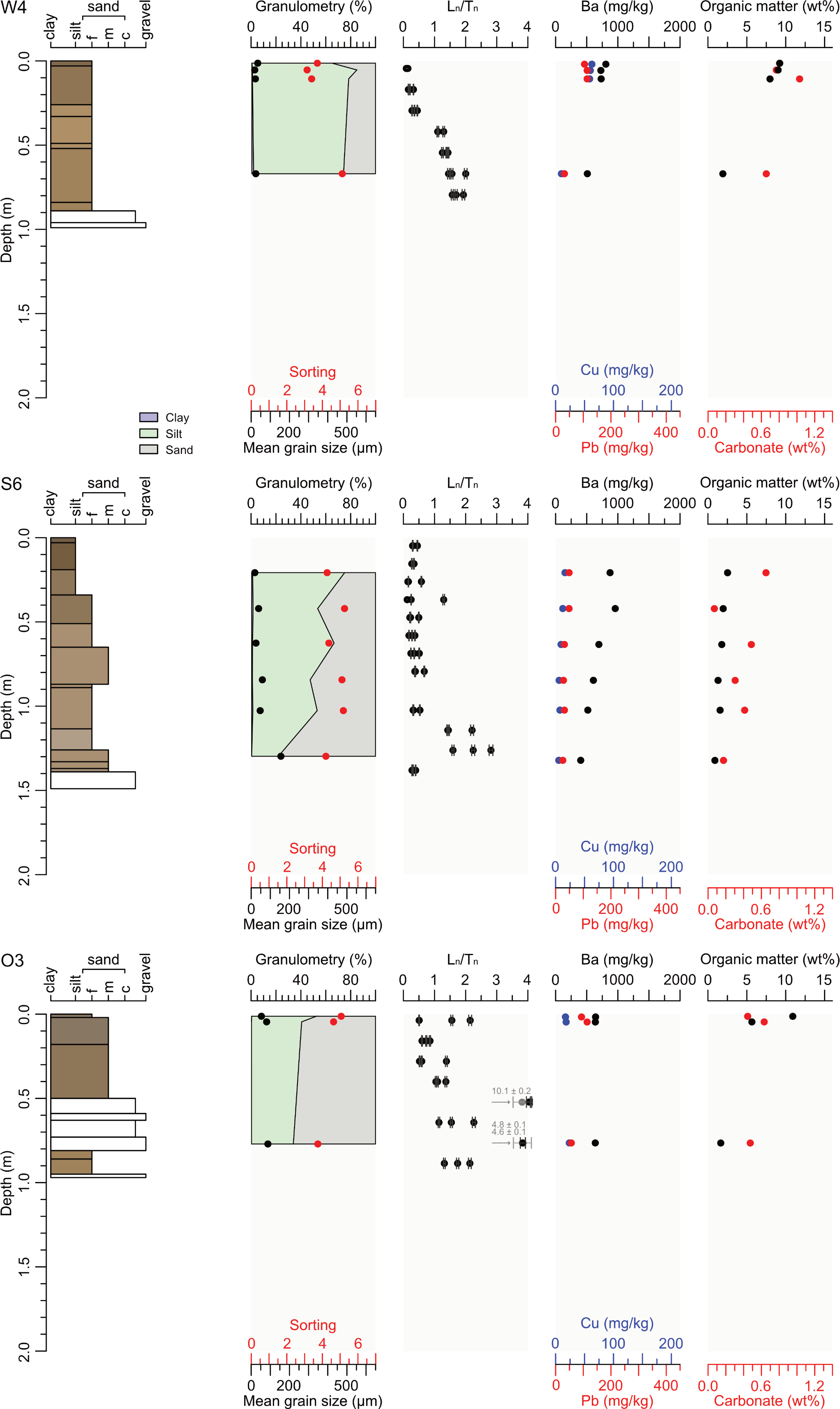 Figure 4Stratigraphic logs of the cores W4 (Wolfach), S6 (Schenkenzell), and O3 (Oberwolfach), including layers shown in Munsell colours. The columns display (from left to right) grain size distribution; values (black); concentrations of Ba (black), Pb (red), and Cu (blue); and the wt % of both OM and carbonate. The extreme values at 0.52 and 0.76 m depth in O3 likely represent partial bleaching related to a flood event.