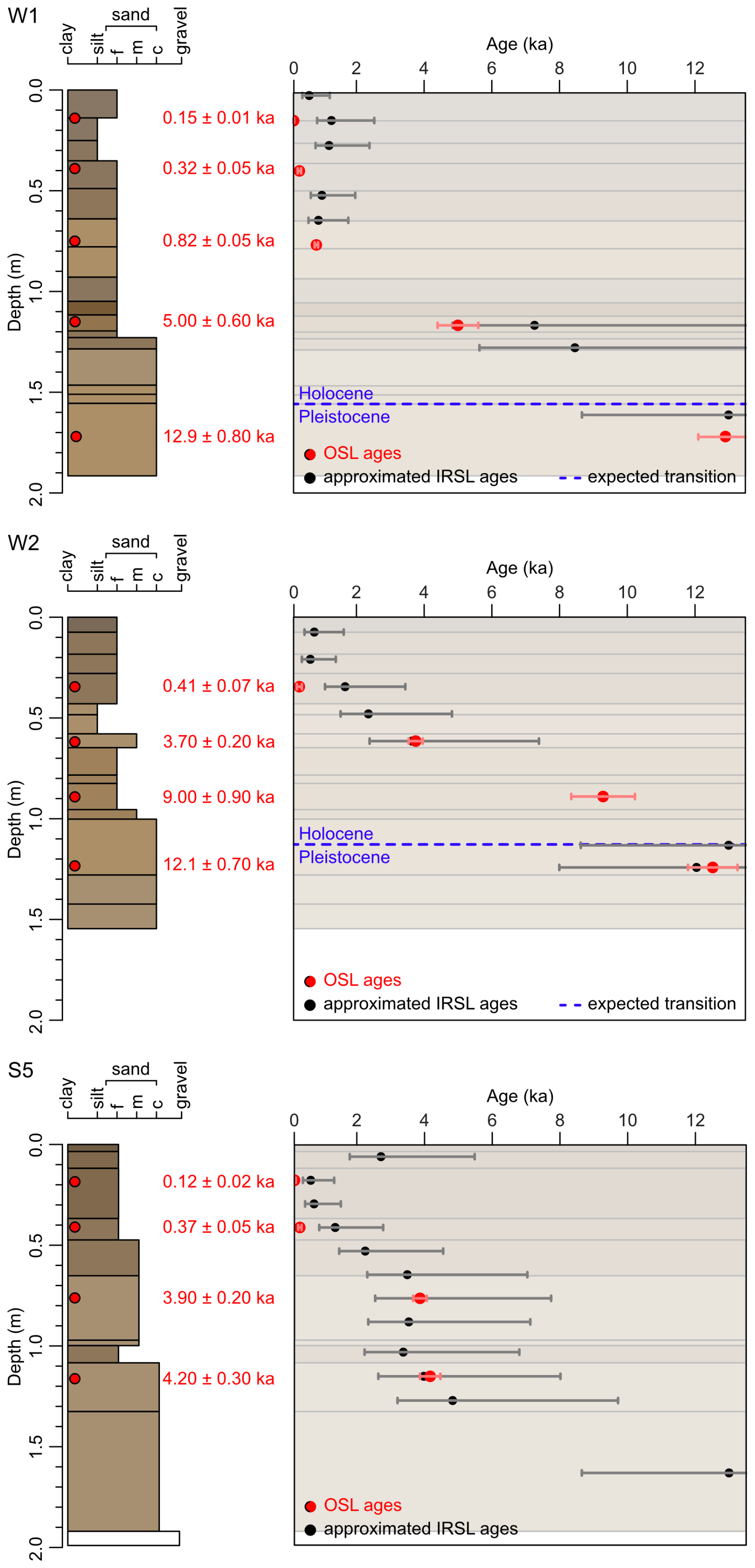Figure 5Comparison of OSL ages and approximated IRSL ages from screening of the main cores. Error bars of the approximated IRSL ages: 50 % of the D0 uncertainty (details: Sect. 3.4). Backgrounds of the plotting area (age over depth) are the stratigraphic layers taken from Fig. 3. Expected Pleistocene–Holocene transition based on sedimentological descriptions and OSL dating: drawn for interpretation purposes; exact depths are unknown.