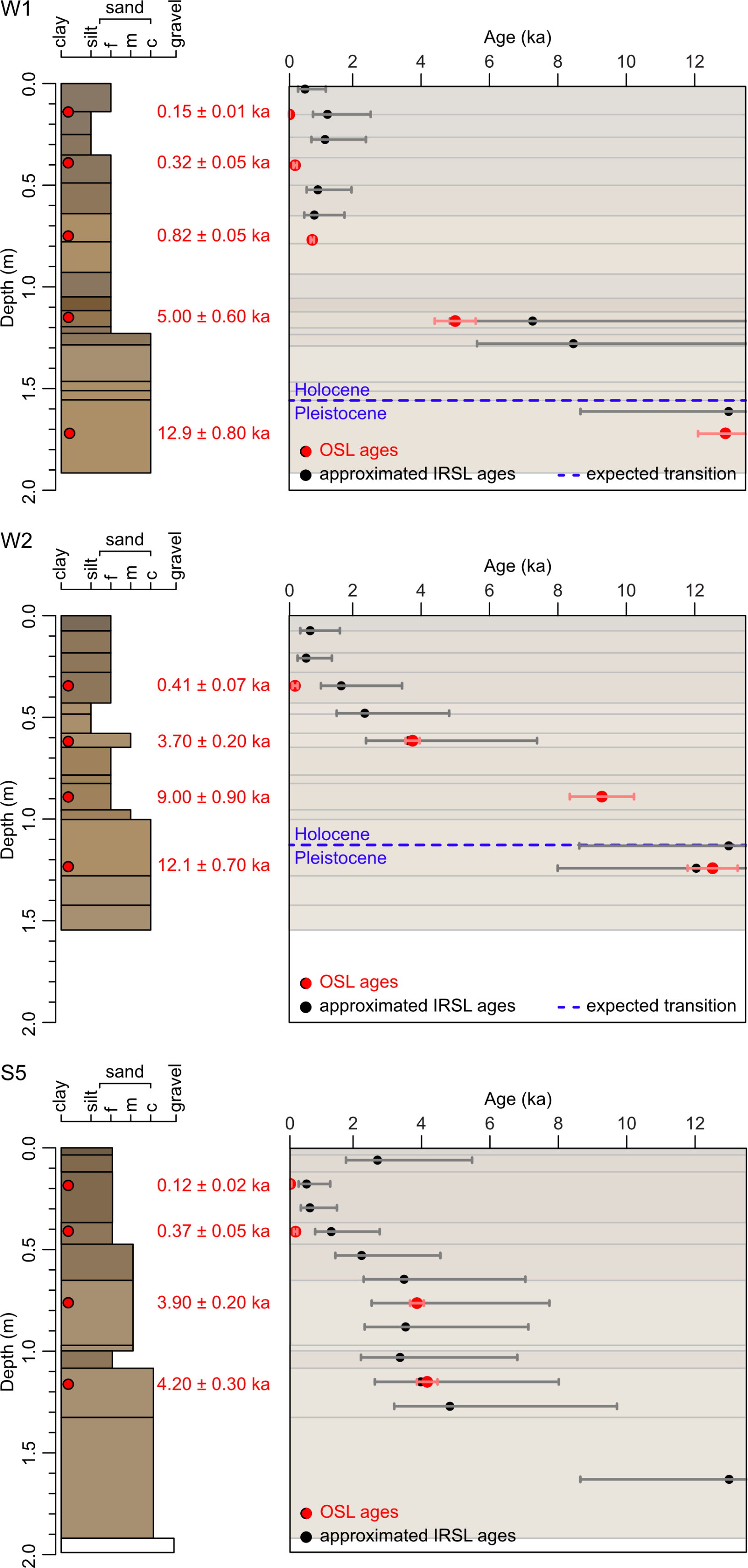 The five OSL ages for core W1 are in stratigraphical order and place floodplain deposition between 12.9 ± 0.80 ka (1.72 m b.g.l., W1-180) and 0.15 ± 0.01 ka (0.14 m b.g.l., W1-30; Table 1). Sedimentation rates derived from these ages are 0.07 ± 0.01 mm a−1 for the late Pleistocene–early Holocene, 0.1 ± 0.01 mm a−1 for the middle to late Holocene, and 1.5 ± 0.44 mm a−1 for the modern period (Table 2). The IRSL-screening values indicate slow aggradation in the lower part of the core, followed by one phase of fast accumulation with average values of around 0.18, starting at 0.76 m b.g.l. Approximated IRSL ages are in good agreement with the OSL ages above 0.75 m b.g.l. but overestimate depositional ages below this depth range (Fig. 3).