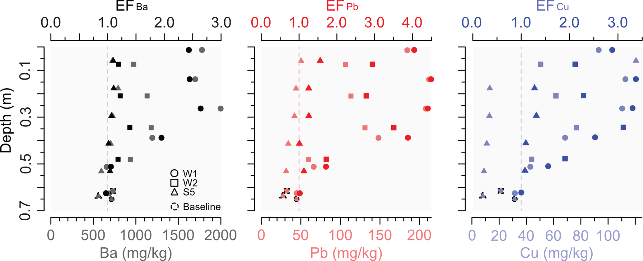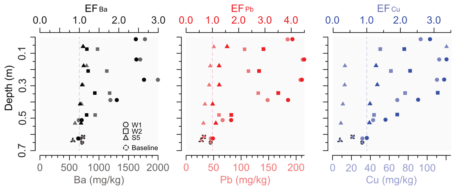 Figure 6Enrichment factors of Ba, Pb, and Cu (top x axis) over depth for the fine overbank deposits for the main cores (y axis), including the baseline samples per core and element. Concentrations over depth as a reference is shown at the bottom x axis. The Cu peak in the core S5 is excluded (Table S5). The dashed vertical line indicates EF = 1.0 as the baseline.