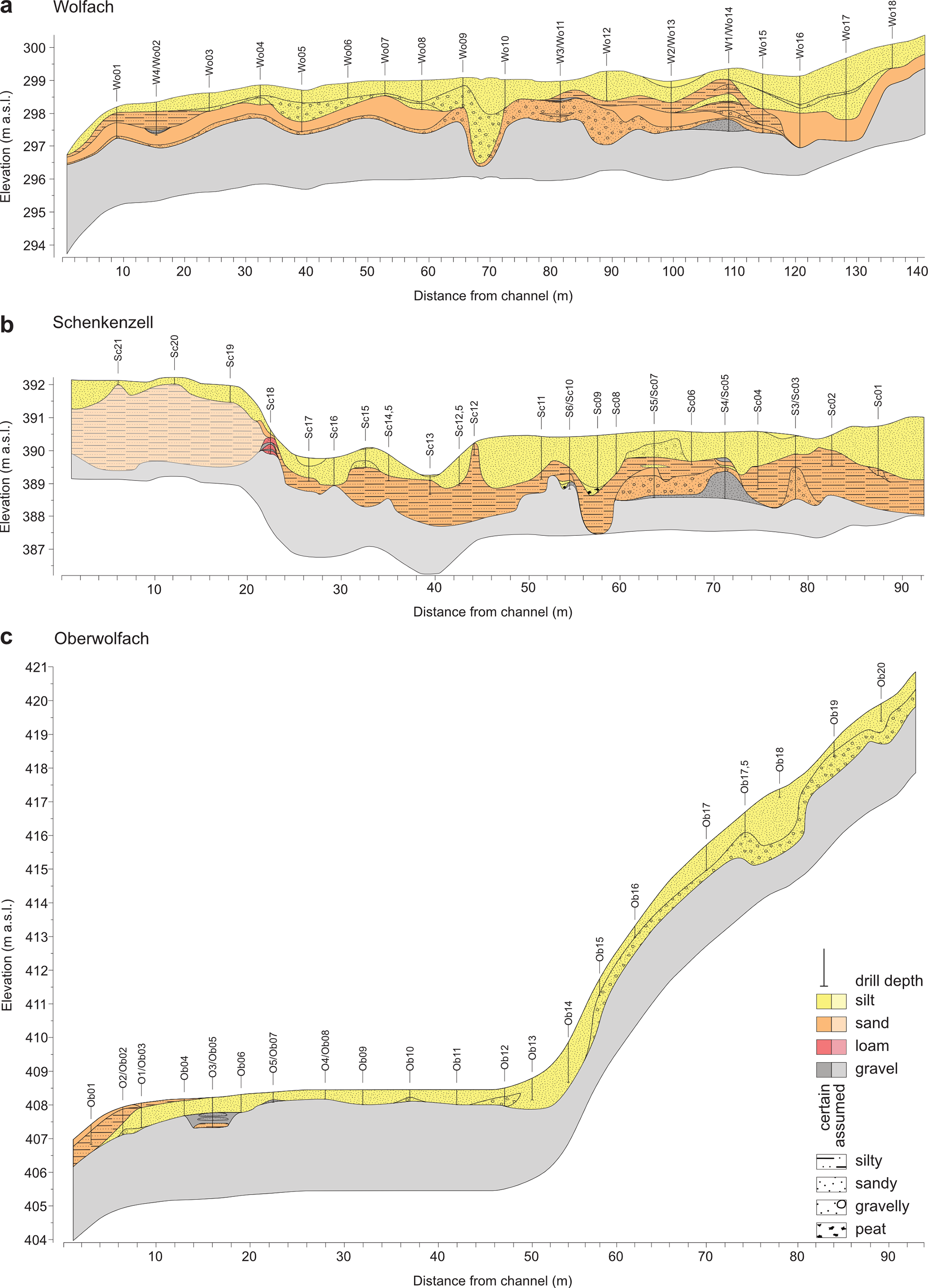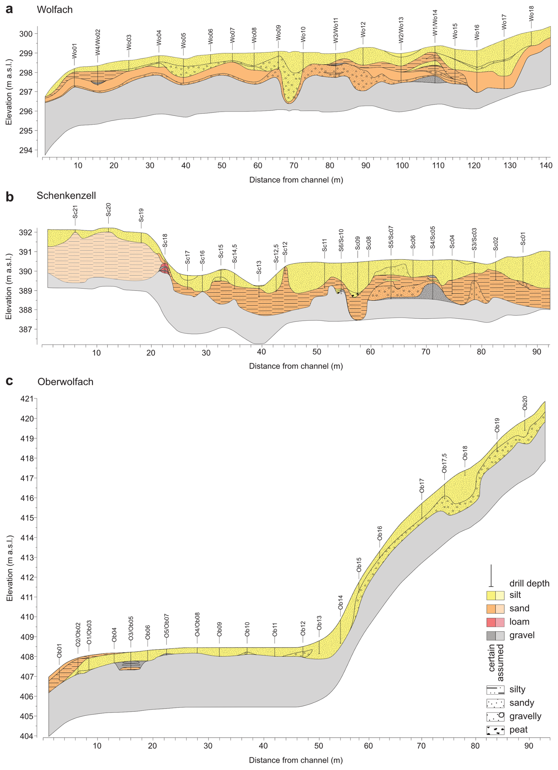 The fine overbank deposits in the Schenkenzell floodplain (Fig. 7B) are of varying thickness: at least 1.60 m b.g.l. (Sc09) around the centre compared to 0.50 m b.g.l. (Sc19) in the elevated riparian area. Dipping silty layers indicate fluvial structures like palaeochannels or scroll bar deposits that are not always reflected in the stratigraphy of the underlying gravel beds. The exception is two layers of peat in sandy silt matrices at similar depths. These are likely to have formed by OM accumulation in formerly active channels rather than under lacustrine conditions as the silty deposits lack the characteristic well sorting and lamination. Coarse material (moderate to coarse sand, gravel) was detected at a relatively shallow depth in, in particular, the palaeochannel section and slope to the elevated riparian area. Sandy material was generally found ca. 1.0 m below silty material, except for the very shallow presence at Sc12. Finally, pure silt layers were mainly found in the currently present floodplain depressions. East of the palaeochannels, silty sand layers are detected at shallower depths. These, in combination with the poorly sorted deposits along the slope, point toward either strong incision and reworking of the floodplain material removing significant amounts of sandy material or human disturbances by dredging sediments out the palaeochannels that were used, if not made, for timber raft.