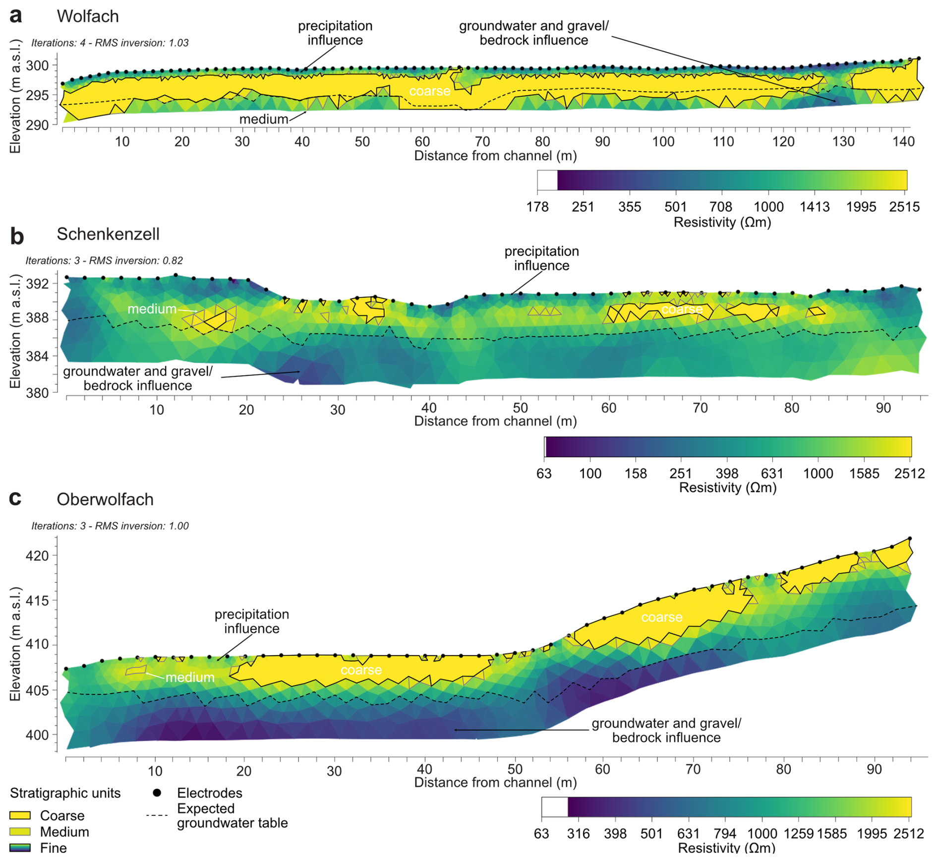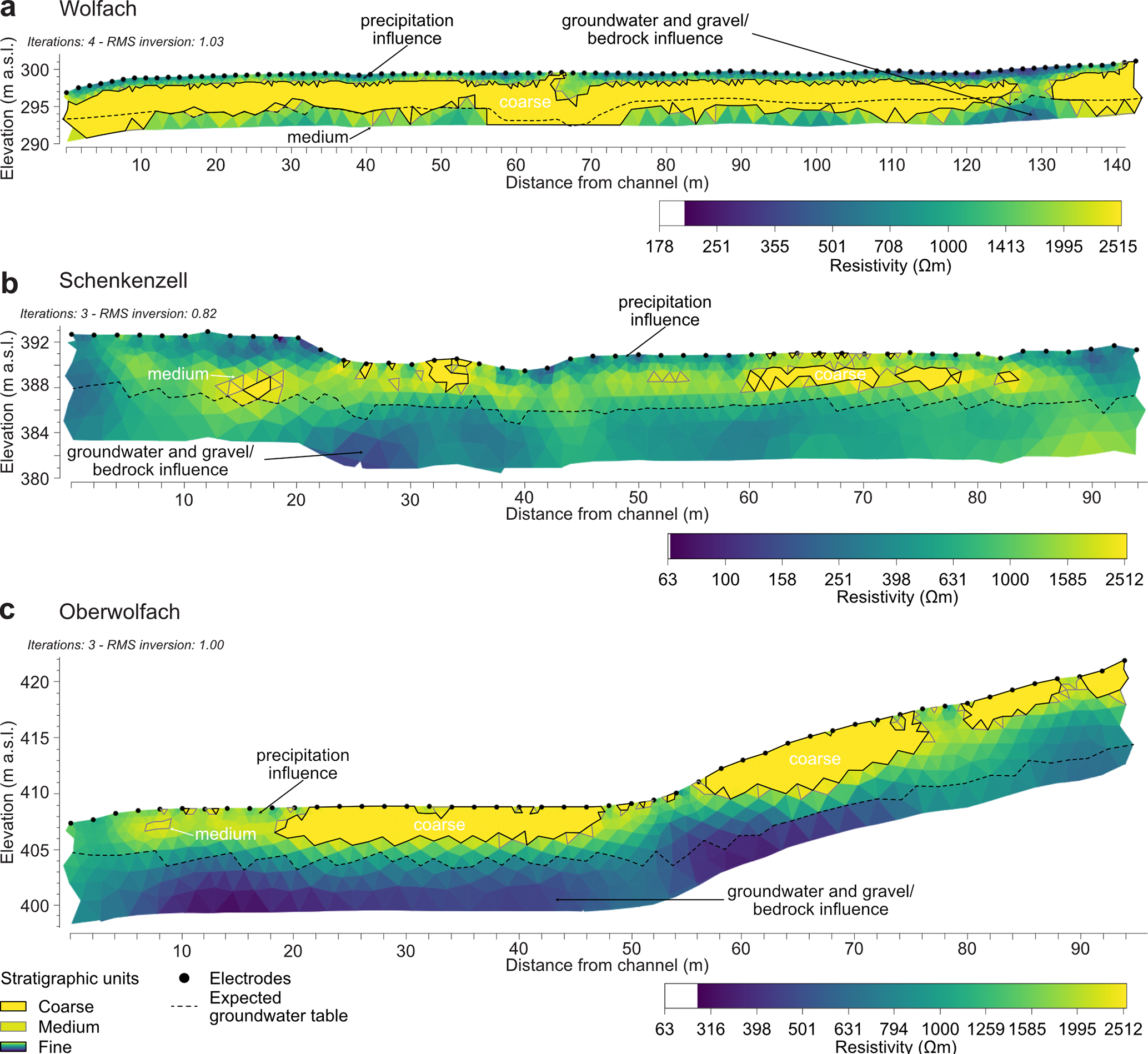 The derived floodplain cross-sections (Fig. 7) are mainly based on drilling results, supported by ERT (Fig. 8) and GPR findings (Fig. 9). While the top of gravel bodies (Fig. 7) are based on the maximum depths of drillings, ERT results helped in separating fine (silt–sandy silt, < 2000 Ωm), medium (silty sand–gravelly sand, 2000–2100 Ωm), and coarse (gravelly sand–gravel, 2100–2500 Ωm) sediments (Fig. 8). These stratigraphical units were identified by cross-referencing resistivities from inversions with low root-mean-square errors (RMSEs) (ca. 1.0 %) and a limited number of iterations (maximum of four) with the sediment cores. High resistivities are commonly associated with dry and coarse deposits, of which the range in values is regional- and site-specific. The low resistivities close to the floodplain surface are likely to be the result of increased water content (Archie, 1941) following precipitation (23.5 L m−2, Deutscher Wetterdienst) that occurred 2 (Wolfach, Oberwolfach) to 3 d (Schenkenzell) before measurement. Unfortunately, the groundwater table is not identifiable everywhere by the ERT or GPR results (Figs. 8 and 9).