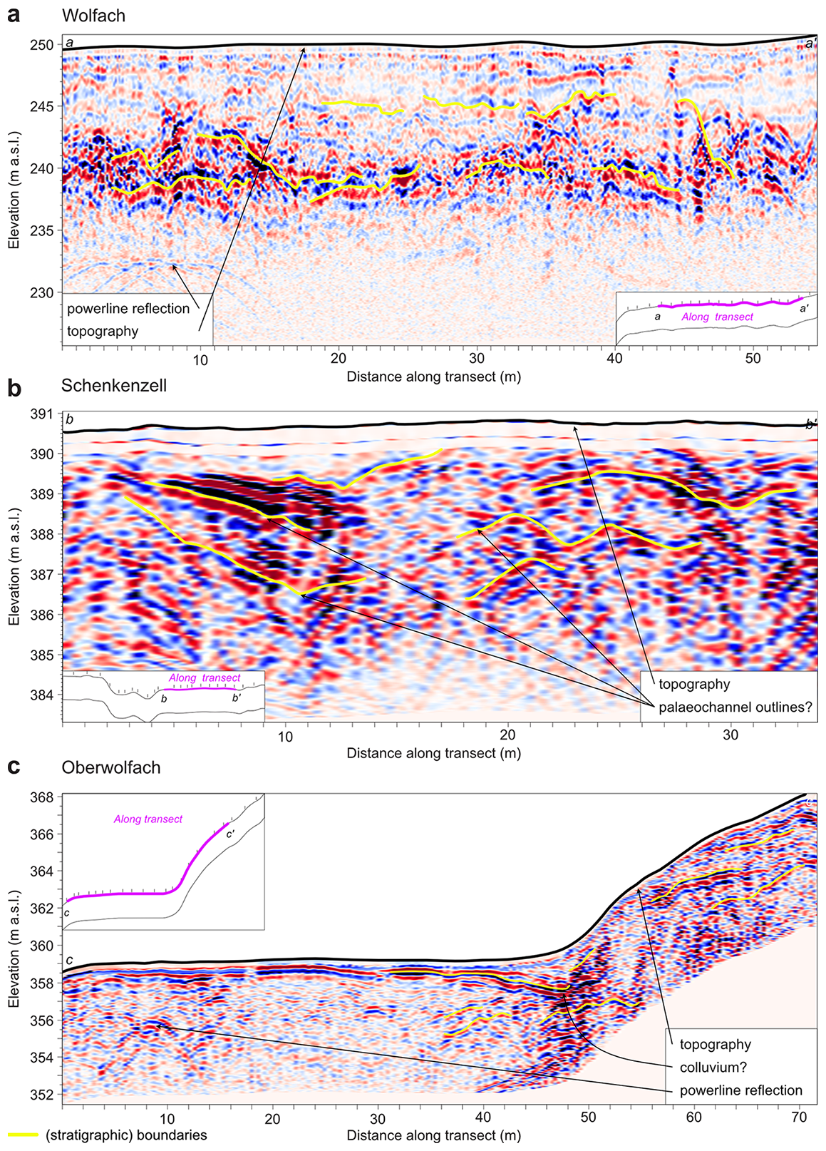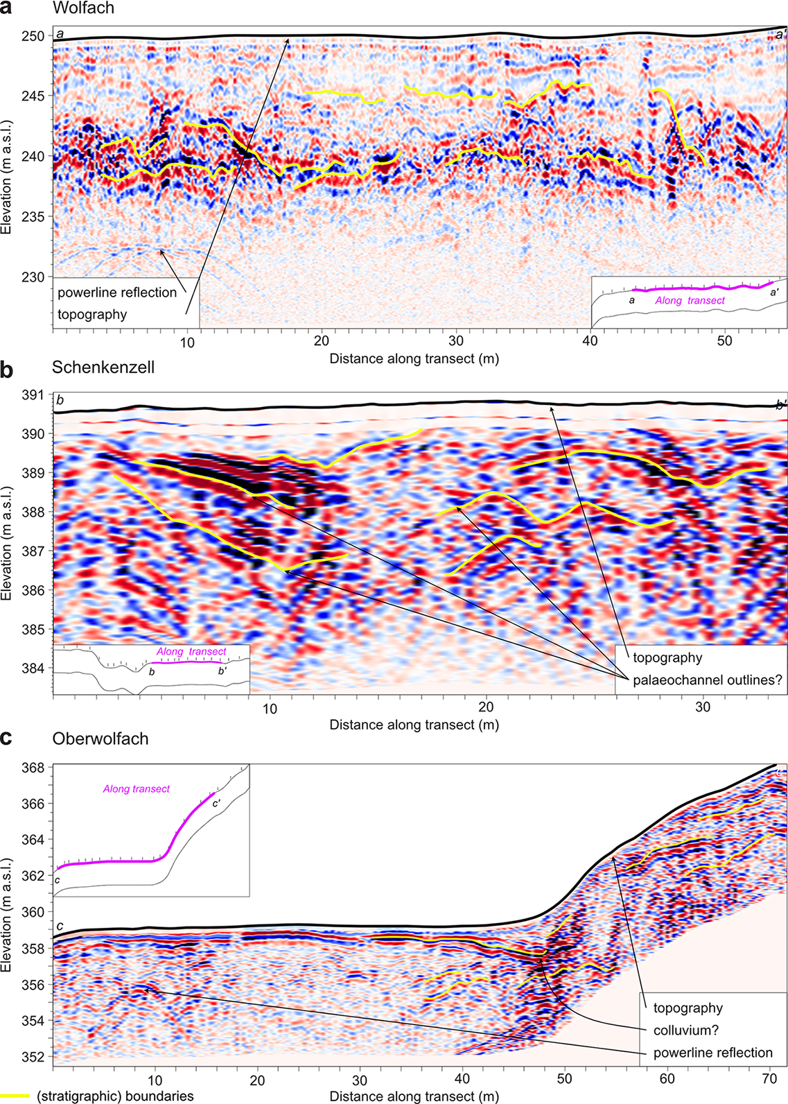 Figure 9Floodplain and hillslope GPR cross-sections after data processing in EKKO Project v. 5. Settings: frequency – 100 MHz; gain or filter – Dewow+SEC2 gain; saturation – 100 %; contrast – 25 %; background subtraction (filter width (m) of 1.5). Insets indicate the position of GPR survey along the floodplain cross-section (Fig. 7).