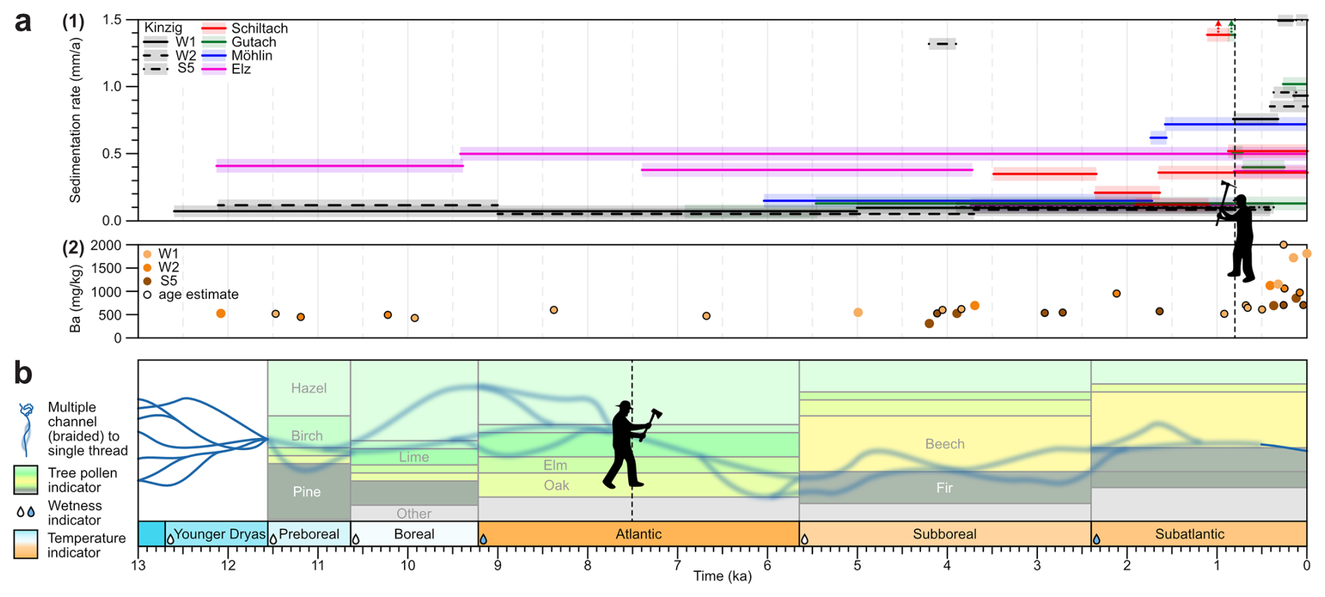 Mitteleuropäische Flusssysteme wandelten sich während des mittleren bis späten Holozäns von natürlich zu anthropogen kontrollierten Systemen, wobei sie einzigartig auf nicht-synchrone und voneinander abhängige natürliche und anthropogene Einflüsse reagierten. Bisherige Forschungen konzentrierten sich hauptsächlich entweder auf große Flusssysteme oder kleine Einzugsgebiete, während mesoskalige Systeme, die diese verbinden, bislang wenig Beachtung fanden. Auen stellen ein ideales Umfald dar, um diese Fragestellung zu untersuchen, da ihre Sedimente frühere Flussdynamiken und menschliche Aktivitäten aufzeichnen. Diese Studie untersucht den Übergang von natürlich zu anthropogen gesteuerten Systemen im mesoskaligen Kinzig-Fluss in Südwestdeutschland unter Verwendung einer Kombination aus Sedimentologie, geochemischer Analyse, Lumineszenzdatierung und geophysikalischen Untersuchungen. Im Kinzig-Einzugsgebiet wurden drei Phasen der Auenakkumulation mit charakteristischen Sedimentationsraten identifiziert: Spätes Pleistozän/Frühes Holozän bis 9,0 ka (0,1 mm a−1), Mittel-/Spätholozän von 9,0 ka bis 0,82 ka (0,3 mm a−1) und Modern von 0,82 ka bis zur Gegenwart (1,1 mm a−1). Passend zu diesen Phasen sind abnehmende Korngrößen und zunehmende Schwermetallkonzentrationen (Barium, Blei, Kupfer) in den Überflutungssedimenten, deren mit der historischen Bergbautätigkeit korrelieren (Höhepunkte im 16. und 18. Jahrhundert). Dies deutet auf den Einfluss des Bergbaus auf die Sedimentzufuhr durch Entwaldung hin, der Hanginstabilität und Sedimentkontaminationen verursachte. Ein Abgleich der Auenstratigraphie mit der Landnutzungsgeschichte des Einzugsgebiets zeigt eine allmähliche Verschiebung zu einem anthropogen veränderten System mit intensiviertem menschlichem Einfluss in den letzten ca. 1000 Jahren. Dies stimmt mit hohen Ablagerungsraten in der Aue überein, die mit der menschlichen Präsenz zusammenhängen. Diese Ergebnisse verdeutlichen den zeitlichen Verlauf und die Dynamik anthropogener Einflüsse auf mesoskalige Flusssysteme in ehemals natürlichen Landschaften.