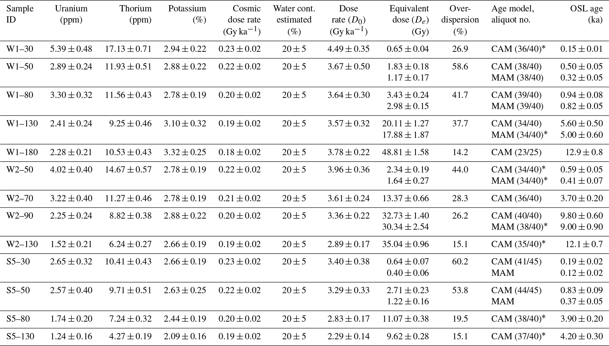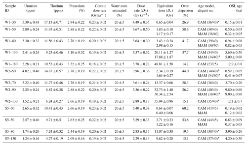 Table 1Dosimetry data and OSL ages of the main cores (coordinates in Table S1). Water content estimation is used for dose rate calculation. MAM ages are preferred over CAM ages for samples with an overdispersion > 20 %.