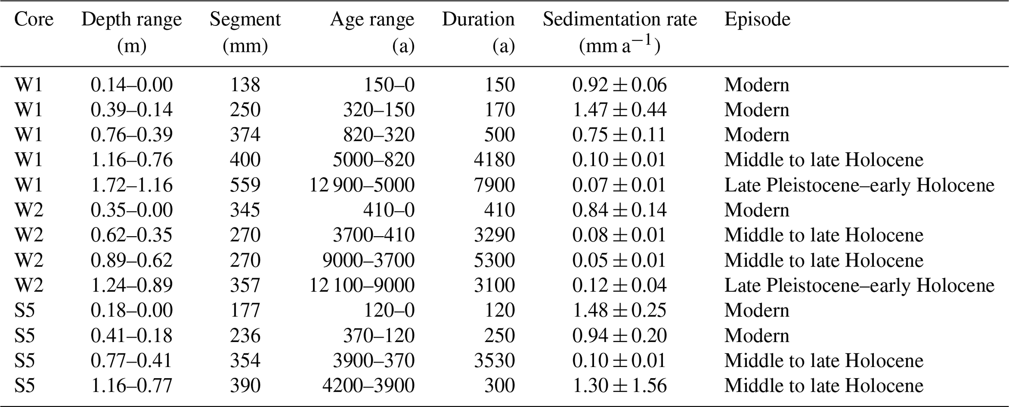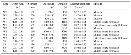 Table 2Sedimentation rates from main cores and attributed episodes. Late Pleistocene–early Holocene: to 9.0 ka. Middle to late Holocene: 9.0–0.82 ka. Modern: 0.82–0 ka.