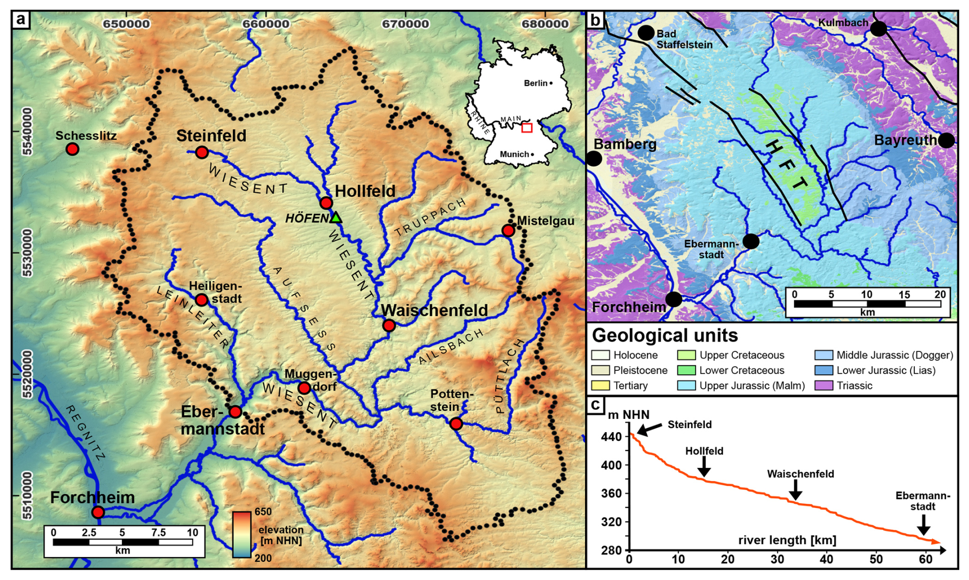 The mesoscale Wiesent River catchment in the northern Franconian Alb covers an area of 1040 km2 and belongs to the Main and Rhine river drainage systems (Fig. 1). From its source near Steinfeld to its confluence with the Regnitz River near Forchheim, the river length is 78 km. The five largest tributaries of the Wiesent River are the rivers Leinleiter, Aufsess, Truppach, Püttlach, and Ailsbach (Fig. 1).