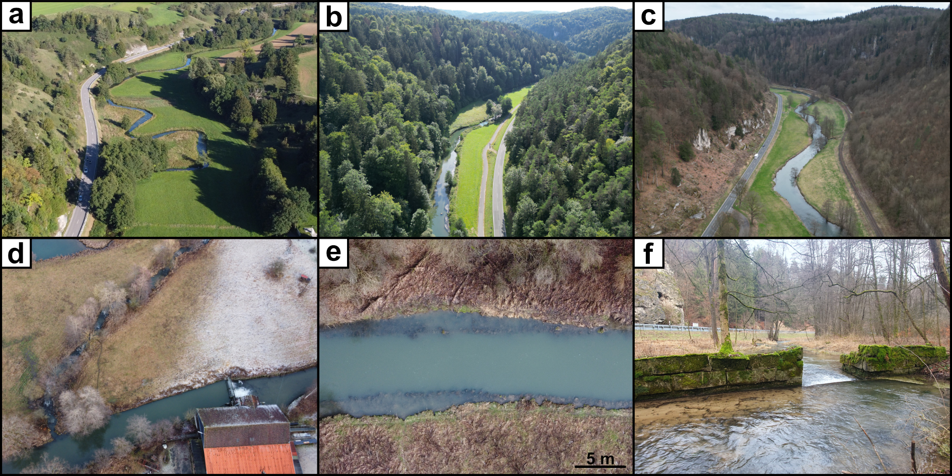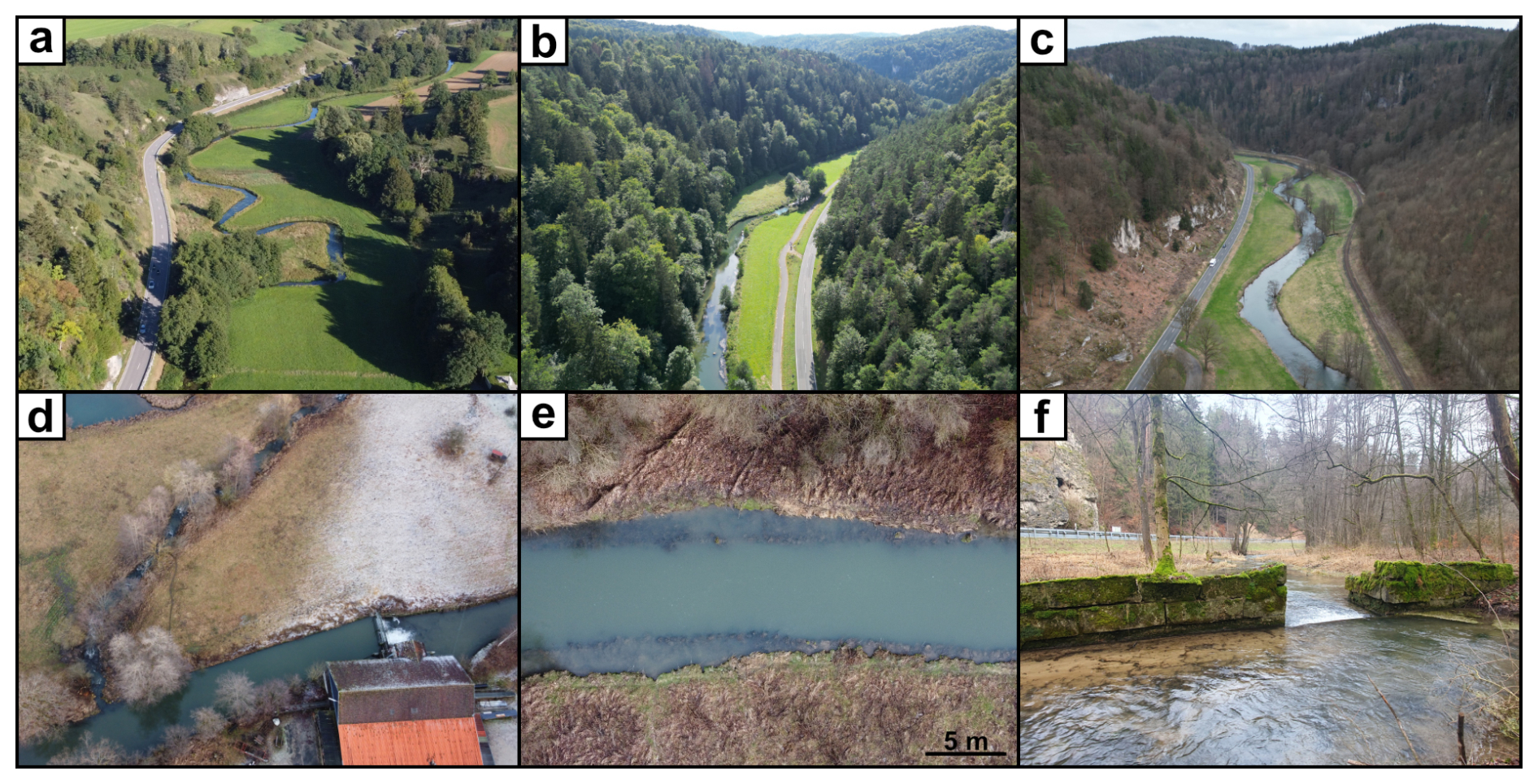 Figure 2Environmental and historical–archaeological characteristics of the Wiesent River valley. (a) The Wiesent River valley upstream, (b) in its middle course, and (c) in the lower course. (d) A mill with a typical mill channel near Waischenfeld, (e) former bank reinforcements recognizable from a drone picture, and (f) the rest of a small weir at the Wiesent River.