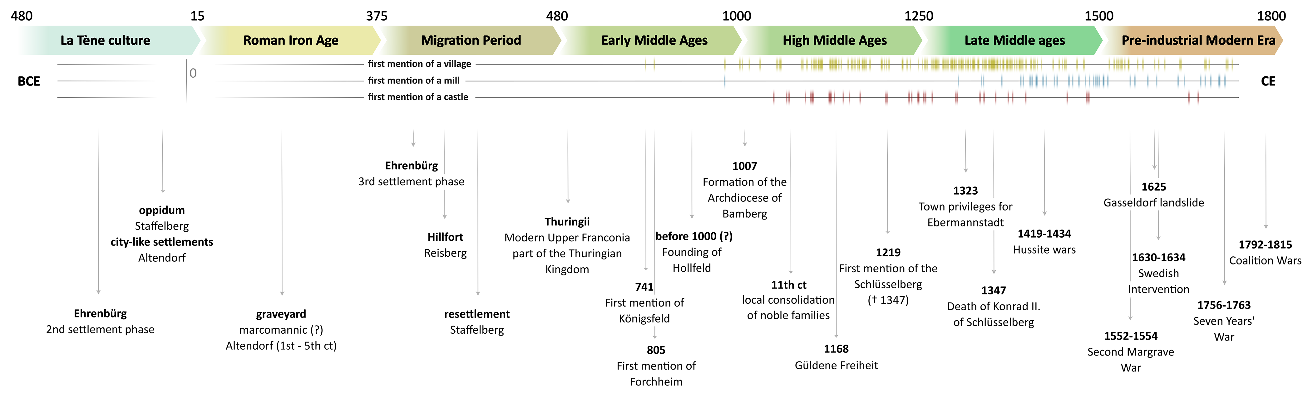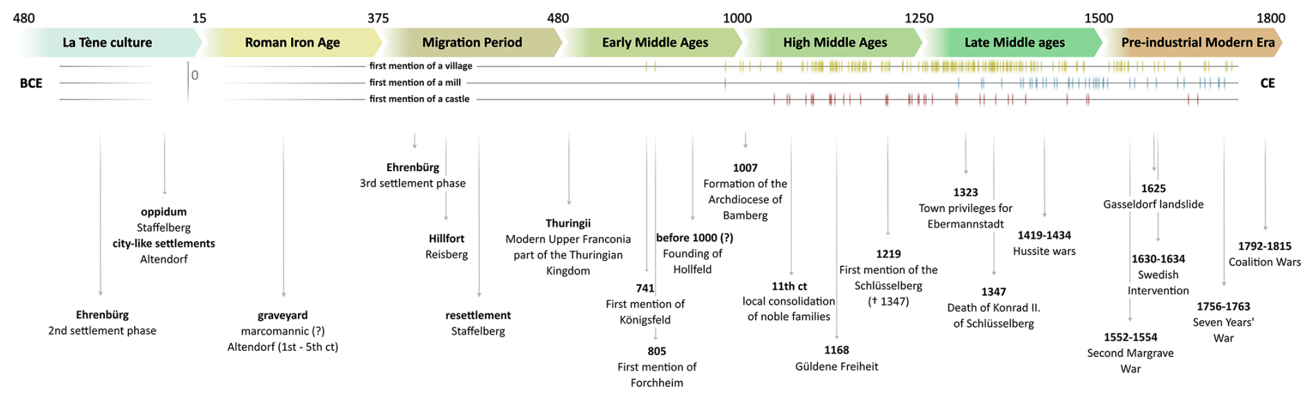 Figure 3Timeline of the historical–archaeological events in Upper Franconia. First documentary mentions of villages, mills (see also Sect. 2.2.2), and castles within the study area were compiled from Guttenberg (1952), Pfanner (1965), Haversath (1987) Fastnacht (2000), George (2008), and archival records in the Staatsarchiv Bamberg. Events shown in the lower part of the timeline are based on Voit et al. (1992), Losert (1993), Störmer (1999), Haberstroh and Faßbinder (2003), Koch (2003), Müller and Seregély (2008), Werther (2011), and Abels (2023), as referenced in the main text. Additionally, data from Fastnacht (2000), Haberstroh and Faßbinder (2003), Jäger et al. (2013), and Abels (2023) were used as orientational markers for first mentions of place names within the study area and for Neolithic settlement evidence.