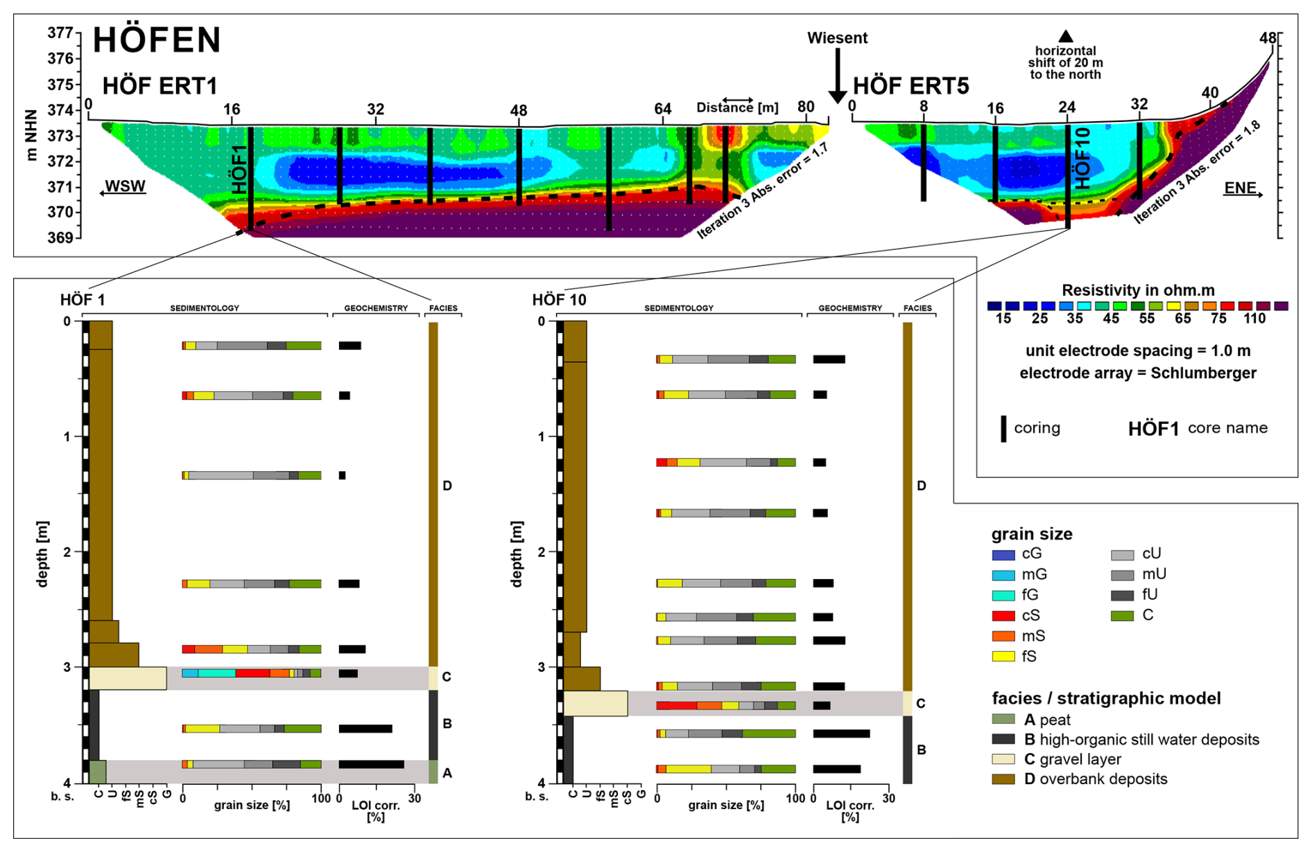 The first geoelectrical and sedimentological investigations at the Höfen site (approx. 2 km south of Hollfeld; see Fig. 1) provide valuable insights into the floodplain evolution of the Wiesent River floodplain (Figs. 5 and 6). The Höfen (HÖF) site was selected because its stratigraphic characteristics are consistent with observations from other investigated locations along the Wiesent River. Consequently, it can be regarded to be a representative site for the floodplain sedimentary development within the study area.