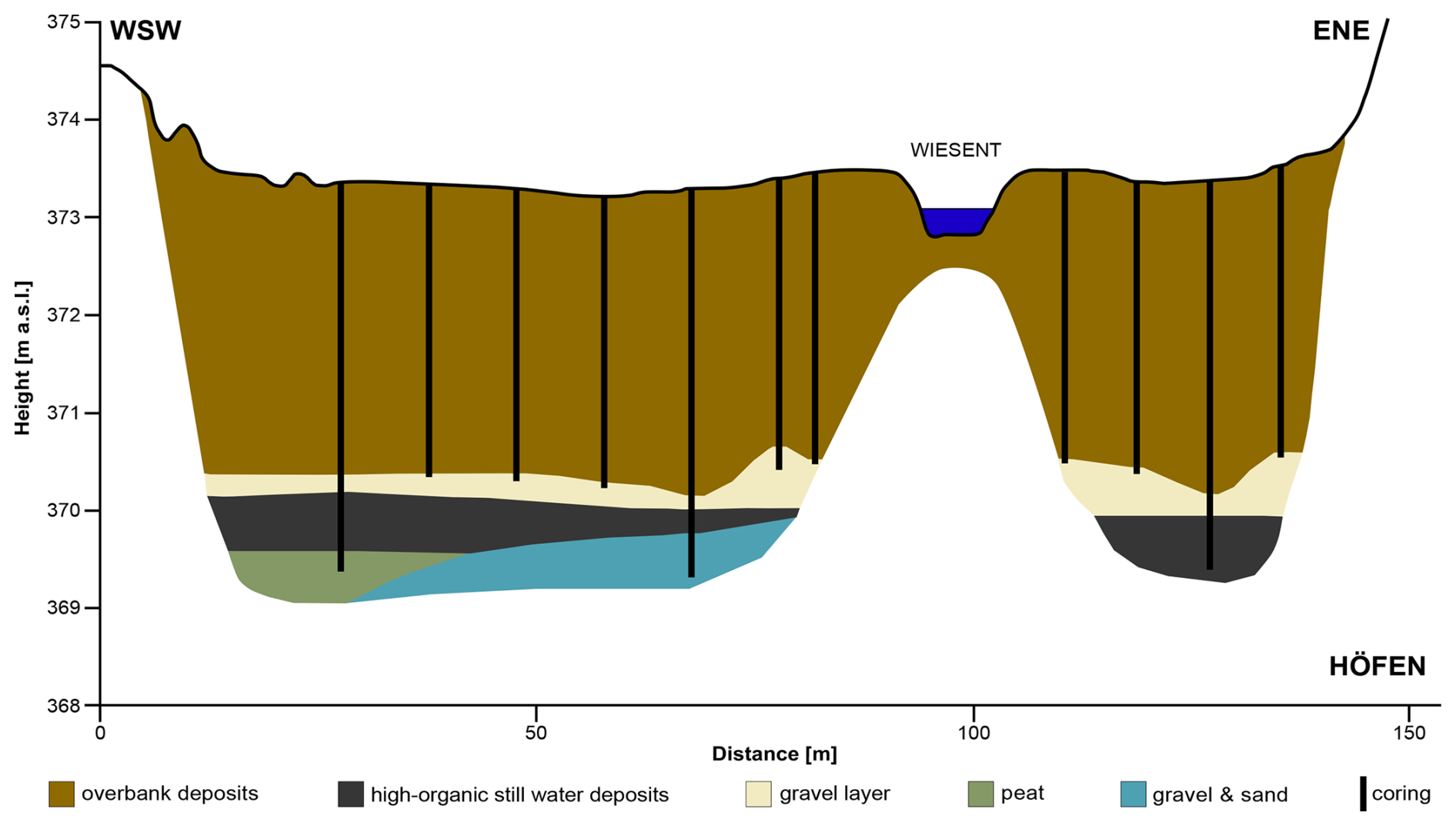 Percussion drilling at the Höfen site along the ERT transects provided continuous sediment cores up to 4 m depth, providing the first detailed stratigraphic framework for the Wiesent River floodplain. The sedimentological characteristics are consistent across the cores, allowing a general stratigraphic succession to be described from base to top, exemplified by the sediment cores HÖF1 and HÖF10.
